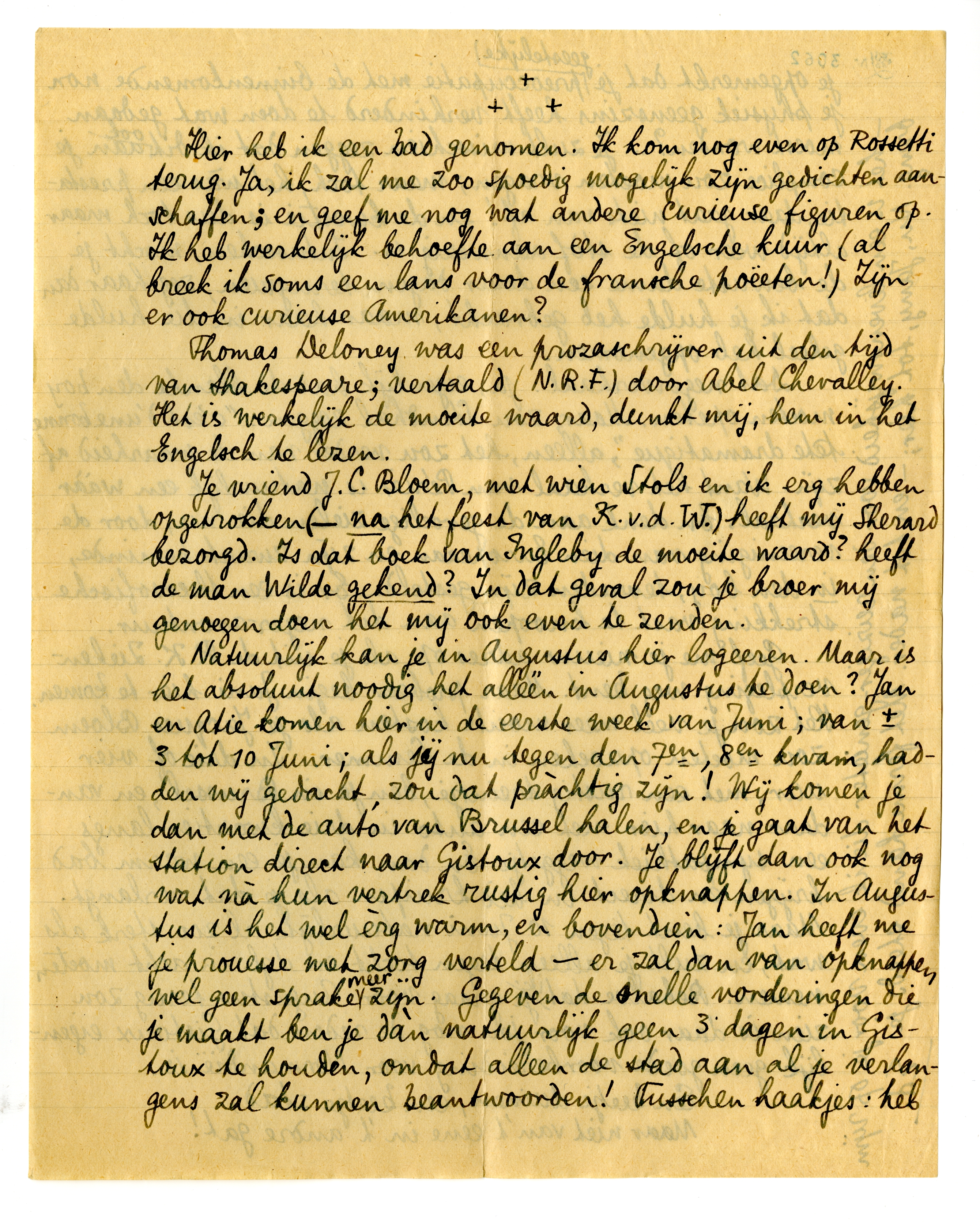 Hier heb ik een bad genomen. Ik kom nog even op Rossetti terug. Ja, ik zal me zoo spoedig mogelijk zijn gedichten aanschaffen; en geef me nog wat andere curieuse figuren op. Ik heb werkelijk behoefte aan een Engelsche kuur (al breek ik soms een lans voor de fransche poëeten!) Zijn er ook curieuse Amerikanen?