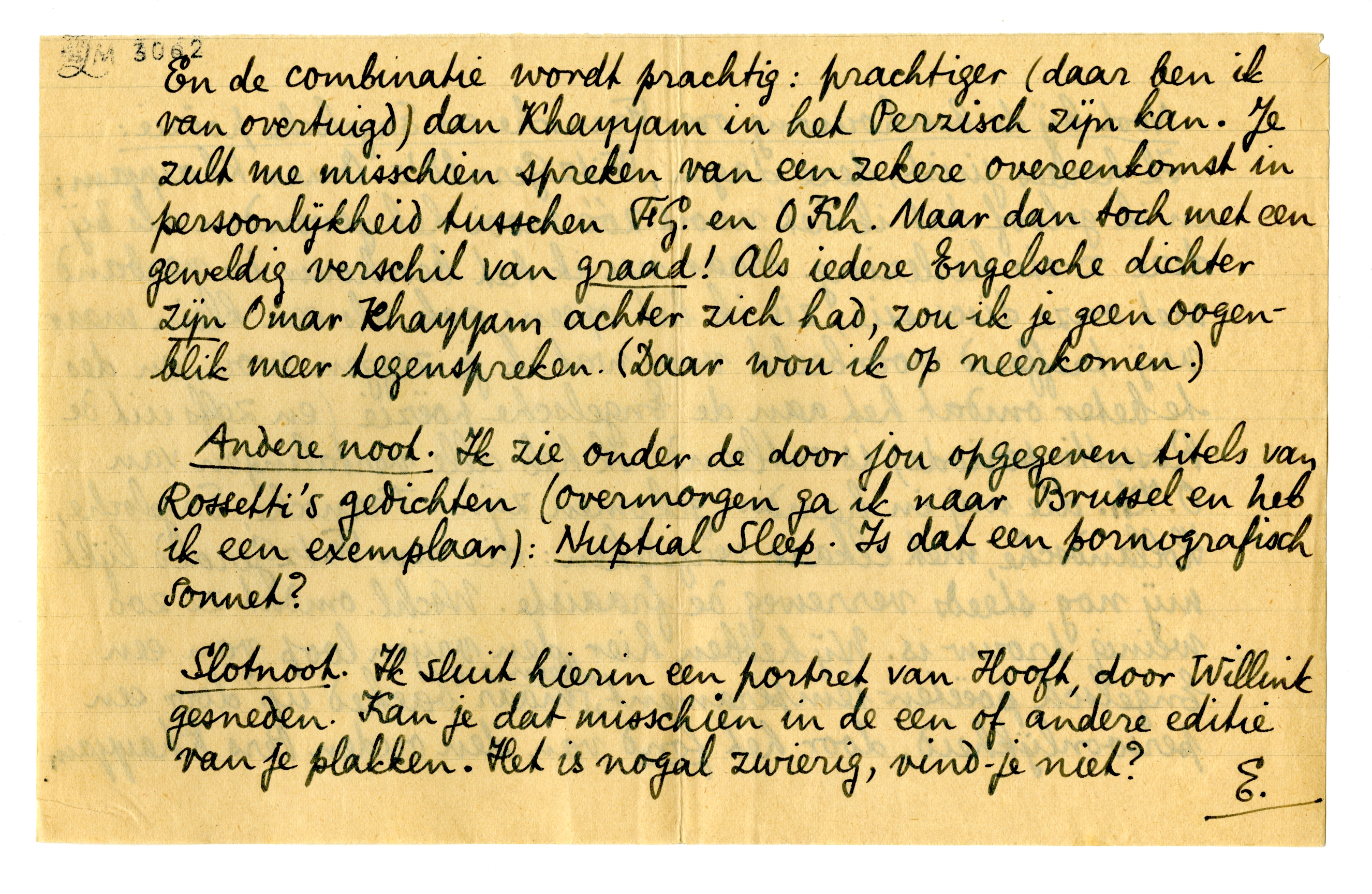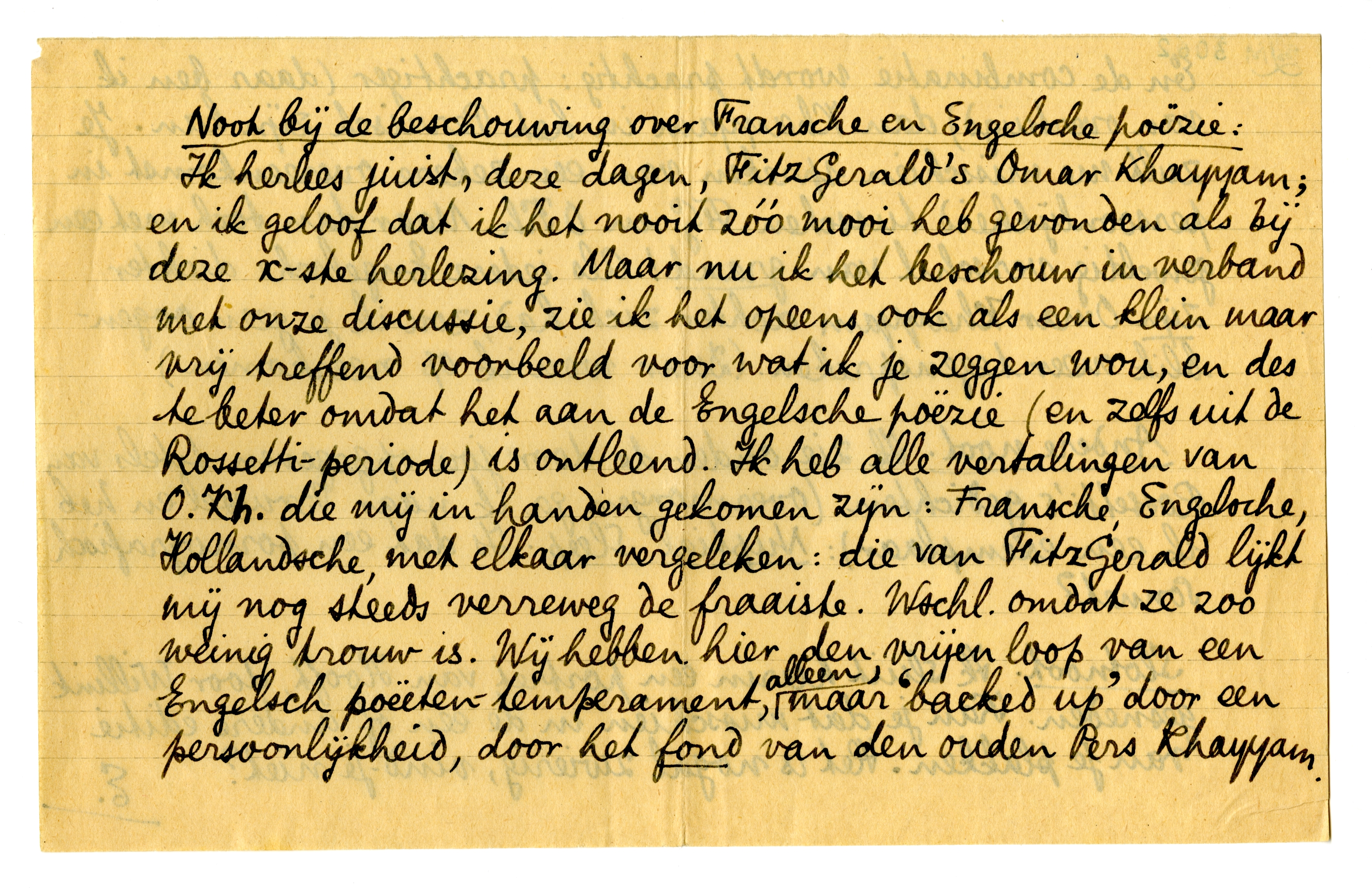 Ik herlees juist, dezer dagen, FitzGerald's Omar Khayyam368; en ik geloof dat ik het nooit zóó mooi heb gevonden als bij deze x-ste herlezing. Maar nu ik het beschouw in verband met onze discussie, zie ik het opeens ook als een klein maar vrij treffend voorbeeld voor wat ik je zeggen wou, en des te beter omdat het aan de Engelsche poëzie (en zelfs uit de Rossetti-periode) is ontleend. Ik heb alle vertalingen van O. Kh. die mij in handen gekomen zijn: Fransche, Engelsche, Hollandsche, met elkaar vergeleken: die van FitzGerald lijkt mij nog steeds verreweg de fraaiste. Wschl. omdat ze zoo weinig trouw is. Wij hebben hier den vrijen loop van een Engelsch poëetentemperament, alleen maar ‘backed up’ door een persoonlijkheid, door het fond van den ouden Pers Khayyam. En de combinatie wordt prachtig: prachtiger (daar ben ik van overtuigd) dan Khayyam in het Perzisch zijn kan. Je zult me misschien spreken van een zekere overeenkomst in persoonlijkheid tussen FG. en OKh. Maar dan toch met een geweldig verschil van graad! Als iedere Engelsche dichter zijn Omar Khayyam achter zich had, zou ik je geen oogenblik meer tegenspreken. (Daar wou ik op neerkomen.)