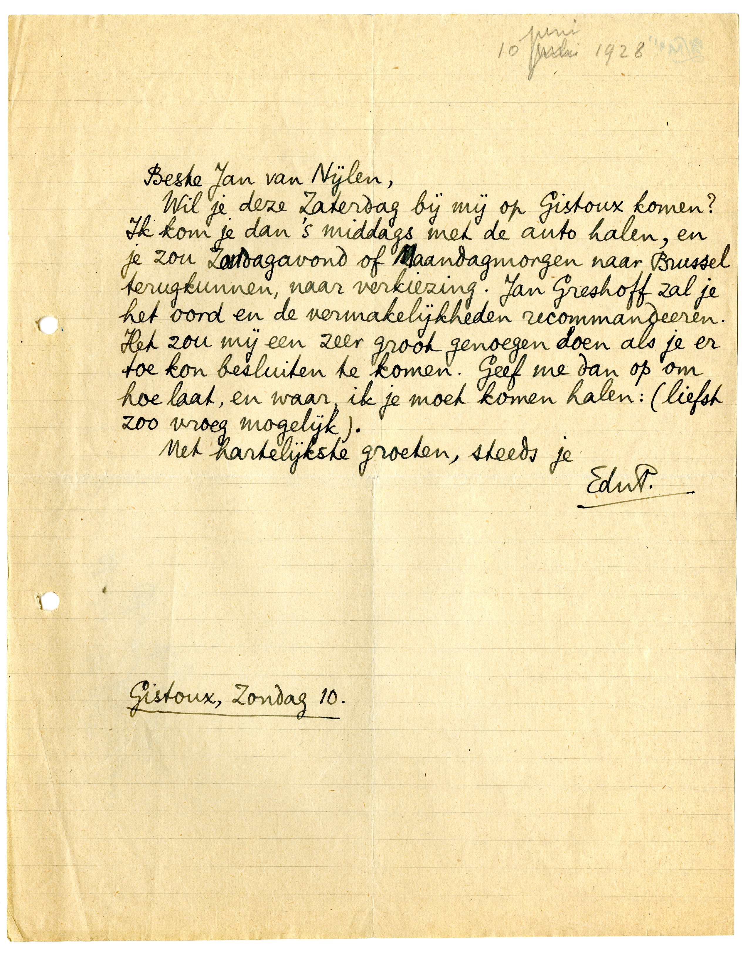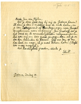 Wil je deze Zaterdag bij mij op Gistoux komen? Ik kom je dan 's middags met de auto halen, en je zou Zondagavond of Maandagmorgen naar Brussel terugkunnen, naar verkiezing. Jan Greshoff zal je het oord en de vermakelijkheden recommandeeren. Het zou mij een zeer groot genoegen doen als je er toe kon besluiten te komen Geef me dan op om hoe laat, en waar, ik je moet komen halen: (liefst zoo vroeg mogelijk).