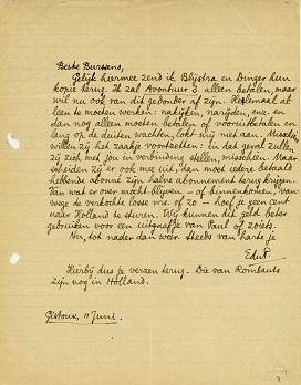 Gelijk hiermee zend ik Blijstra en Dinger hun kopie terug. Ik zal Avontuur 3 alleen betalen, maar wil nu ook van dit gedonder af zijn. Helemaal alleen te moeten werken: nakijken, narijden, enz. en dan nog alleen moeten betalen of vooruitbetalen en lang op de duiten wachten, lokt mij niet aan. Misschien willen zij het zaakje voortzetten: in dat geval zullen zij zich met jou in verbinding stellen, misschien. Maar scheiden zij er ook mee uit, dan moet iedere betaald hebbende abonné zijn halve abonnement terug krijgen. Van wat er over mocht blijven - of binnenkomen, vanwege de verkochte losse nrs. of zo - hoef je geen cent naar Holland te sturen. Wij kunnen dit geld beter gebruiken voor een uitgaafje van Paul of zoiets.