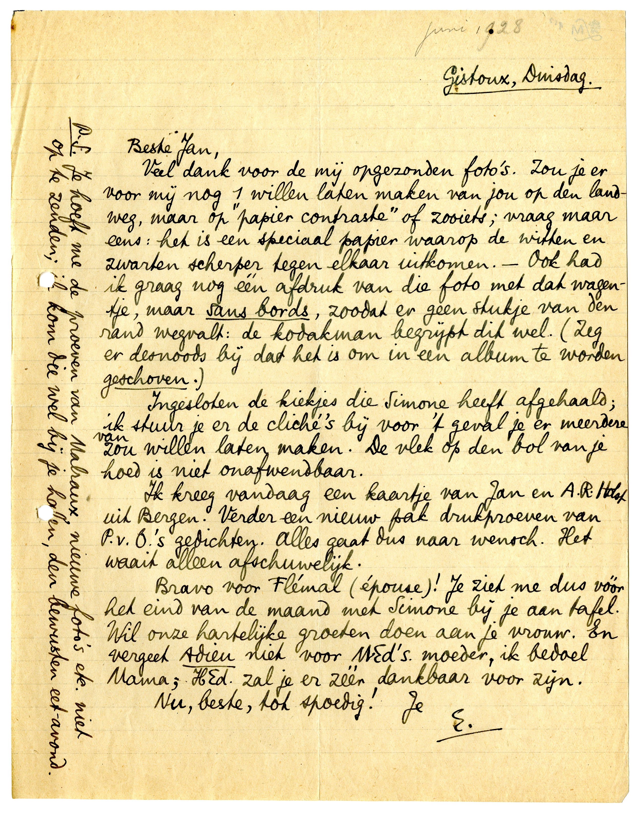 Veel dank voor de mij opgezonden foto's. Zou je er voor mij nog 1 willen laten maken van jou op den landweg, maar op ‘papier contraste’ of zooiets; vraag maar eens: het is een speciaal papier waarop de witten en zwarten scherper tegen elkaar uitkomen. - Ook had ik graag nog één afdruk van die foto met dat wagentje, maar sans bords, zoodat er geen stukje van den rand wegvalt: de kodakman begrijpt dit wel. (Zeg er desnoods bij dat het is om in een album te worden geschoven.)