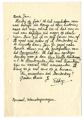 Hierbij de foto! Ik heb nagekeken voor wat betreft die Rouge et Noir-historie; maar tot mijn schrik zie ik dat men er niet aan tafeltjes zit maar op stoelerijen.476 Dus zie ik er zelf liever van af. Ik weet niet zeker of ik Donderdag in de Lunette477 kom; Jan Gr. gaat naar Paerels.478 Stuur me de proefvellen van het Aangezicht.479 Ik heb een aardiger Barbey voor je dan Une Vieille Maîtresse, n.l. de Memoranda, die veel levendiger zijn en vooral veel amusanter. Ik breng ze je wel eens op je bureau.