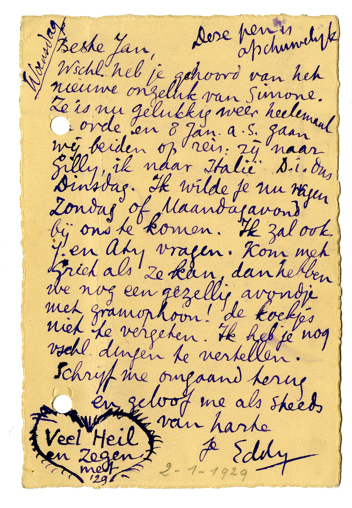 Wschl. heb je gehoord van het nieuwe ongeluk van Simone. Ze is nu gelukkig weer heelemaal in orde en 8 Jan. a.s. gaan wij beiden op reis: zij naar Gilly,486 ik naar Italië. D.i. dus Dinsdag. Ik wilde je nu vragen Zondag of Maandagavond bij ons te komen. Ik zal ook J. en Aty vragen. Kom met Griet als ze kan, dan hebben we nog een gezellig avondje met gramophoon! de koekjes niet te vergeten. Ik heb je nog vschl. dingen te vertellen.