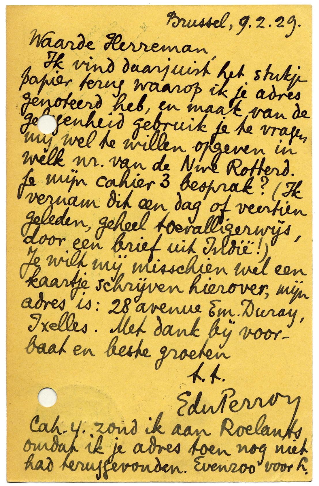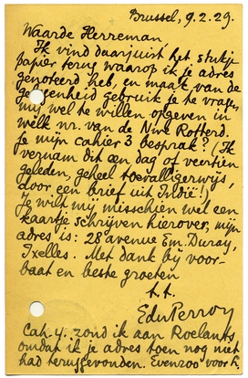 Je wilt mij misschien wel een kaartje schrijven hierover, mijn adres is: 28 avenue Em. Duray, Ixelles. Met dank bij voorbaat en beste groeten