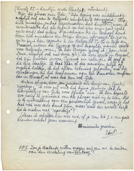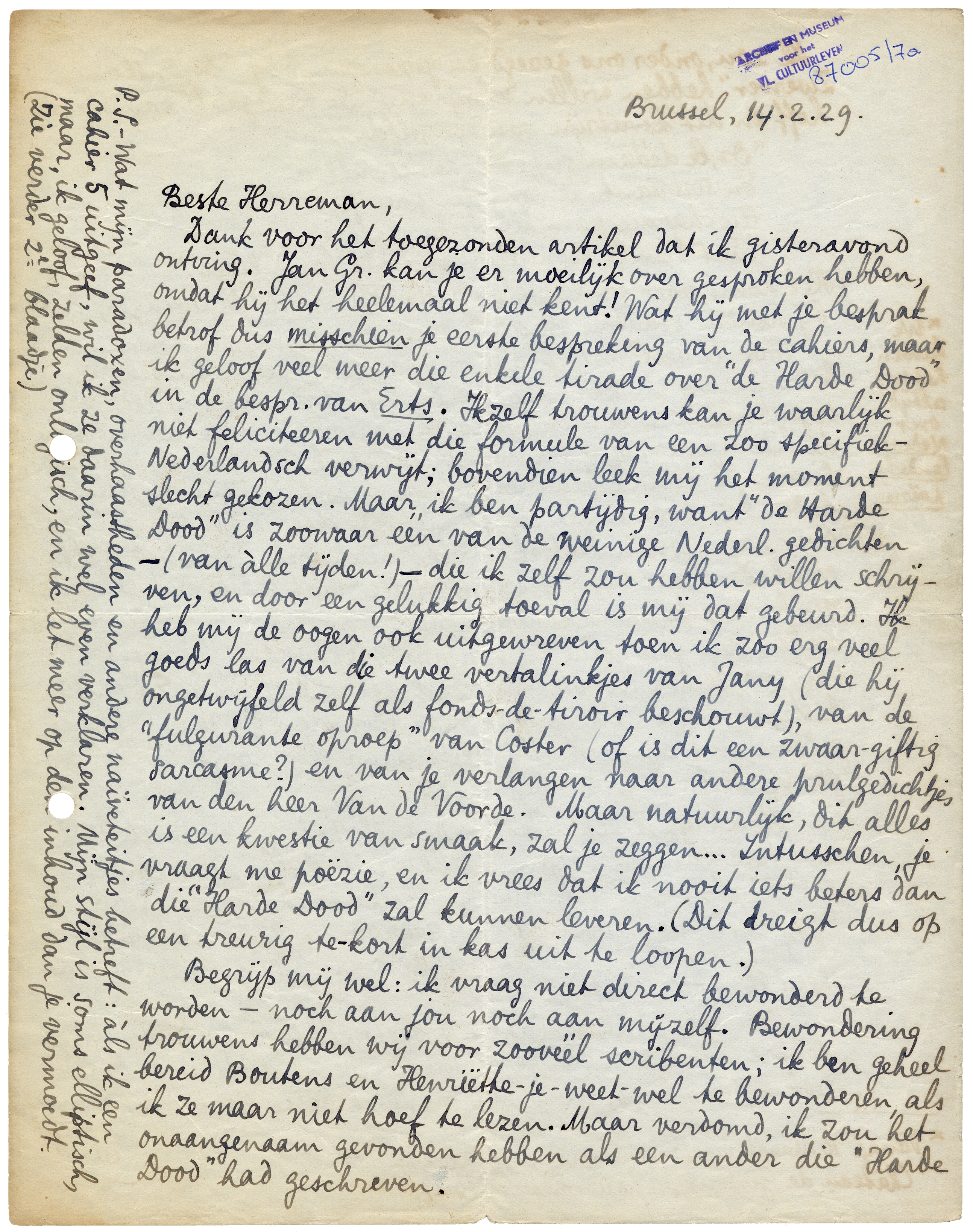 Dank voor het toegezonden artikel dat ik gisteravond ontving.515 Jan. Gr. kan je er moeilijk over gesproken hebben, omdat hij het heelemaal niet kent! Wat hij met je besprak betrof dus misschien je eerste bespreking van de cahiers, maar ik geloof veel meer die enkele tirade over ‘de Harde Dood’ in de bespr. van Erts.516 Ikzelf trouwens kan je waarlijk niet feliciteeren met die formule van een zoo specifiek-Nederlandsch verwijt; bovendien leek mij het moment slecht gekozen. Maar ik ben partijdig, want ‘de Harde Dood’ is zoowaar één van de weinige Nederl. gedichten - (van àlle tijden!) - die ik zelf zou hebben willen schrijven, en door een gelukkig toeval is mij dat gebeurd. Ik heb mij de oogen ook uitgewreven toen ik zoo erg veel goeds las van die twee vertalinkjes van Jany (die hij ongetwijfeld zelf als fonds-de-tiroir beschouwt), van de ‘fulgurante oproep’ van Coster (of is dit een zwaar-giftig sarcasme?) en van je verlangen naar andere prulgedichtjes van de heer Van de Voorde.517 Maar natuurlijk, dit alles is een kwestie van smaak, zal je zeggen... Intusschen, je vraagt me poëzie, en ik vrees dat ik nooit iets beters dan die ‘Harde Dood’ zal kunnen leveren. (Dit dreigt dus op een treurig te-kort in kas uit te loopen.)