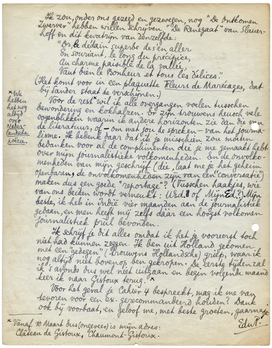 Voor de rest* wil ik alle overgangen voelen tusschen bewondering en kokhalzen. Er zijn trouwens heusch vele oogenblikken waarin ik andere horizonten zie dan die van de literatuur, of - om met jou te spreken - van het journalisme. Ik bedenk daar dat ik je misschien zou moeten bedanken voor al de complimenten die je me gemaakt hebt over mijn journalistieke volkomenheden. En de onvolkomenheden van mijn geschrijf (die, laat me je het geheim openbaren, de onvolkomenheden zijn van een ‘conversatie’) maken dus een goede ‘reportage’? (Tusschen haakjes, wie van ons beiden wordt verneukt: UEd. of MijnEd.?) Mijn beste, ik heb in Indië vier maanden aan de journalistiek gedaan, en men heeft mij zelfs dààr een hoogst volkomen journalistiek prùl bevonden.