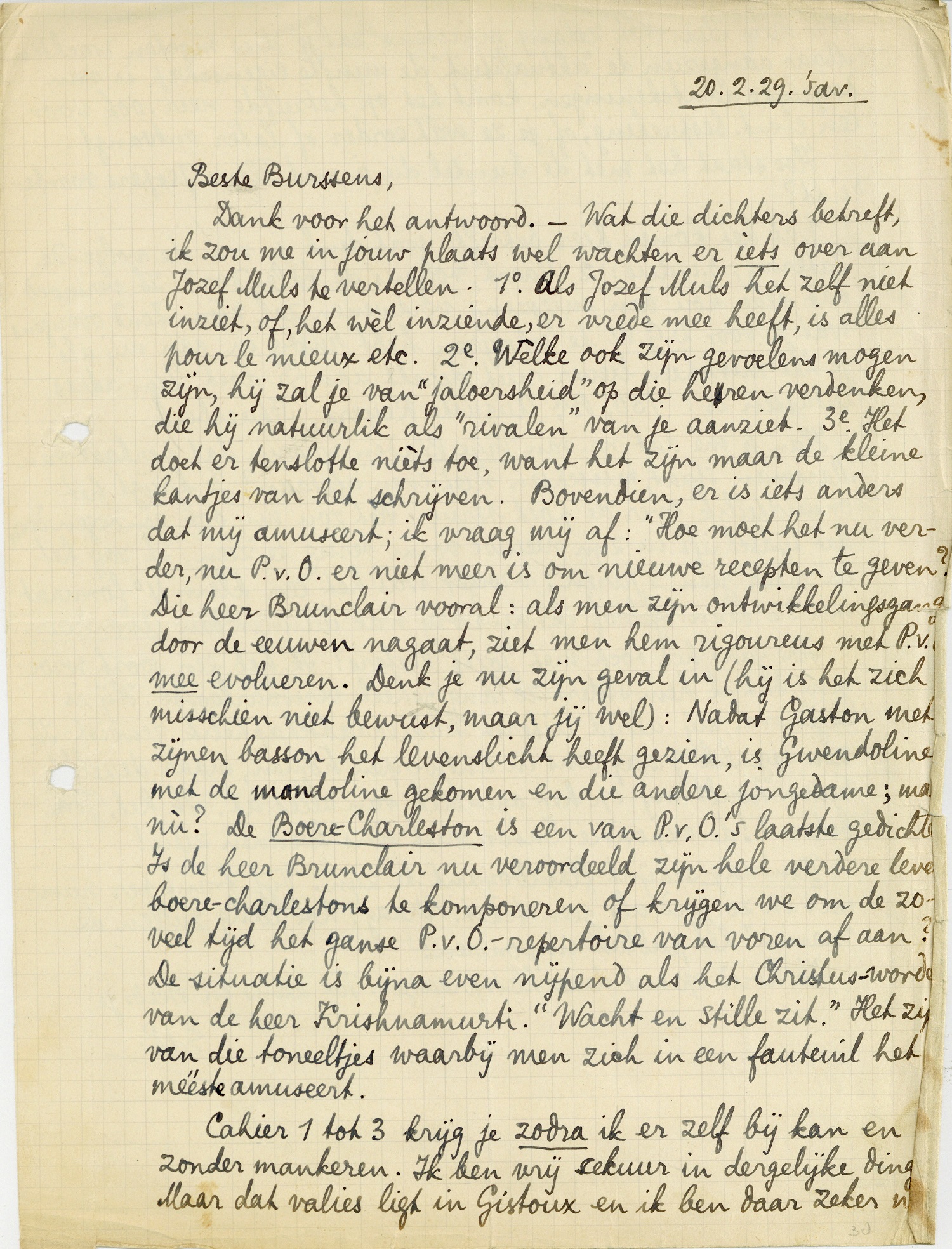 Dank voor het antwoord. - Wat die dichters betreft, ik zou me in jouw plaats wel wachten er iets over aan Jozef Muls te vertellen. 1o. Als Jozef Muls het zelf niet inziet, of, het wèl inziende, er vrede mee heeft, is alles pour le mieux etc. 2e. Welke ook zijn gevoelens mogen zijn, hij zal je van ‘jaloersheid’ op die heren verdenken, die hij natuurlik als ‘rivalen’ van je aanziet. 3e. Het doet er tenslotte nièts toe, want het zijn maar de kleine kantjes van het schrijven. Bovendien, er is iets anders dat mij amuseert; ik vraag mij af: ‘Hoe moet het nu verder, nu P.v.O. er niet meer is om nieuwe recepten te geven? Die heer Brunclair vooral: als men zijn ontwikkelingsgang door de eeuwen nagaat, ziet men hem rigoureus met P.v.O. mee evolueren. Denk je nu zijn geval in (hij is het zich misschien niet bewust, maar jij wel): Nadat Gaston met zijnen basson het levenslicht heeft gezien, is Gwendoline met de mandoline gekomen en die andere jongedame; maar nù? De Boere-Charleston is een van P.v.O.'s laatste gedichten. Is de heer Brunclair nu veroordeeld zijn hele verdere leven boere-charlestons te komponeren of krijgen we om de zoveel tijd het ganse P.v.O.-repertoire van voren af aan? De situatie is bijna even nijpend als het Christus-worden van de heer Krishnamurti. ‘Wacht en stille zit.’ Het zijn van die toneeltjes waarbij men zich in een fauteuil het mééste amuseert.