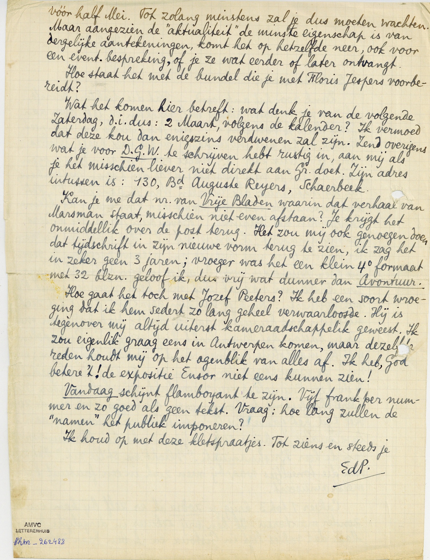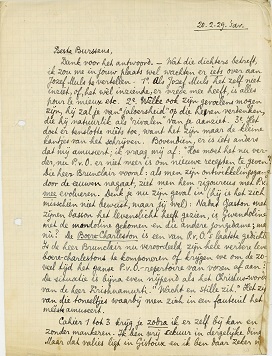 Wat het komen hier betreft: wat denk je van de volgende Zaterdag, d.i. dus: 2 Maart, volgens de kalender? Ik vermoed dat deze kou dan enigszins verdwenen zal zijn. Zend overigens wat je voor D.G.W. te schrijven hebt rustig in, aan mij als je het misschien liever niet direkt aan Gr. doet. Zijn adres intussen is: 130, Bd Auguste Reyers, Schaerbeek.
