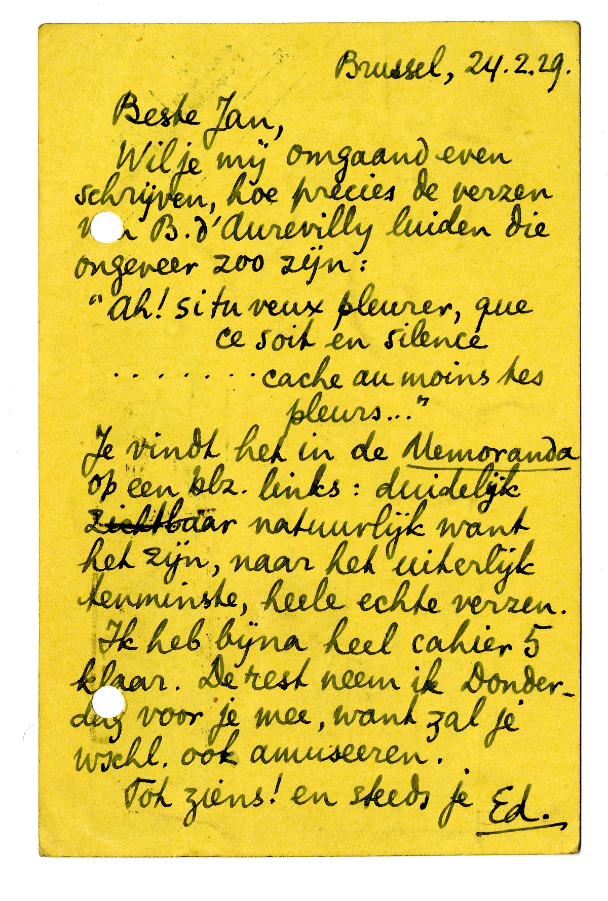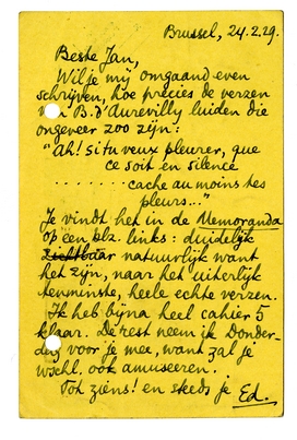 Wil je mij omgaand even schrijven, hoe precies de verzen van B. d'Aurevilly luiden die ongeveer zoo zijn: