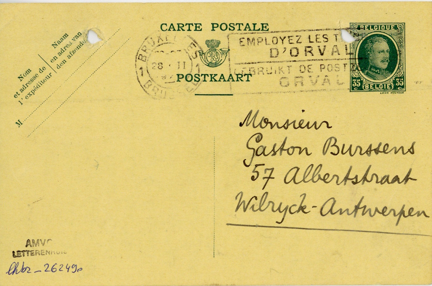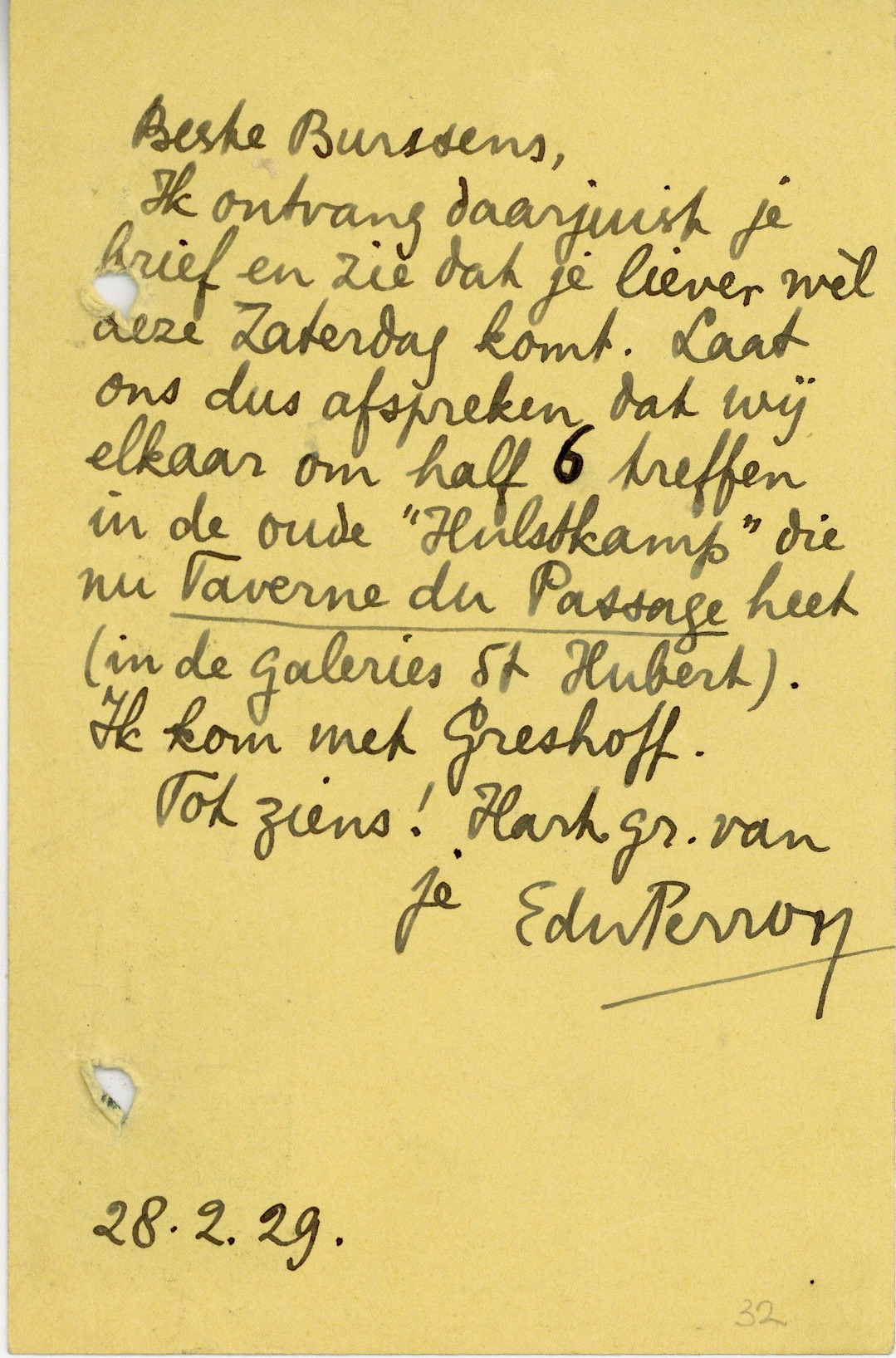 Ik ontvang daarjuist je brief en zie dat je liever wèl deze Zaterdag komt. Laat ons dus afspreken dat wij elkaar om half 6 treffen in de oude ‘Hulstkamp’ die nu Taverne du Passage heet (in de galeries St Hubert). Ik kom met Greshoff.