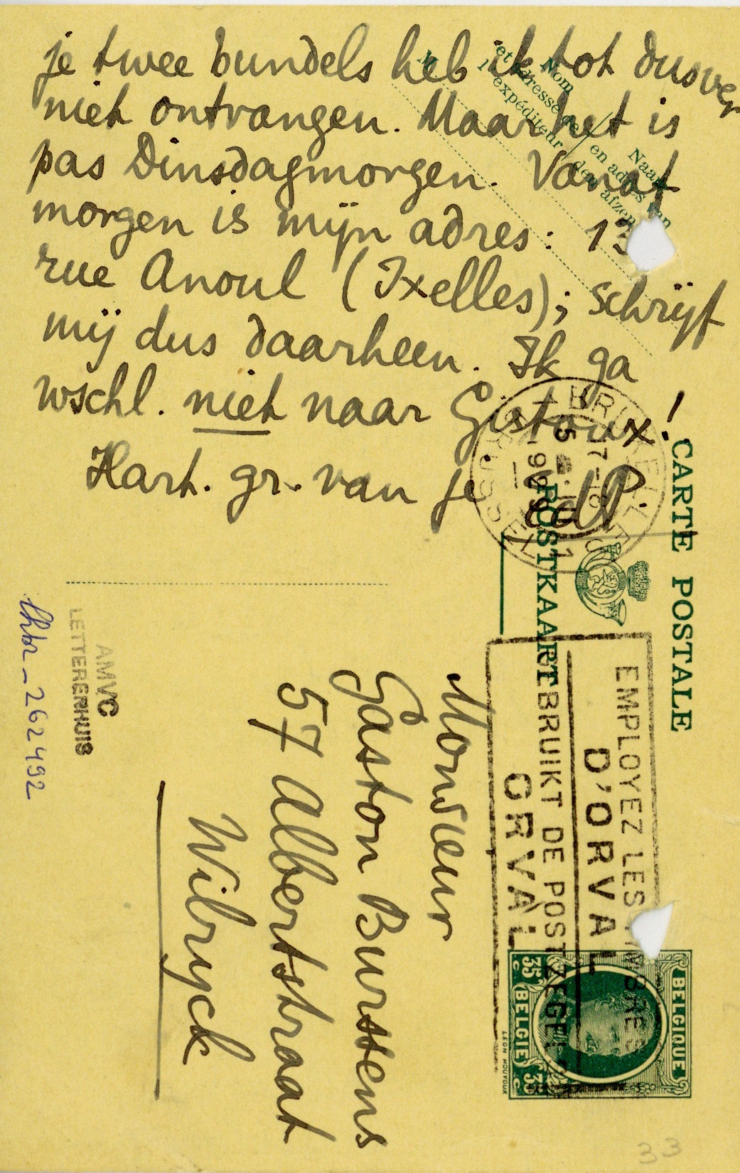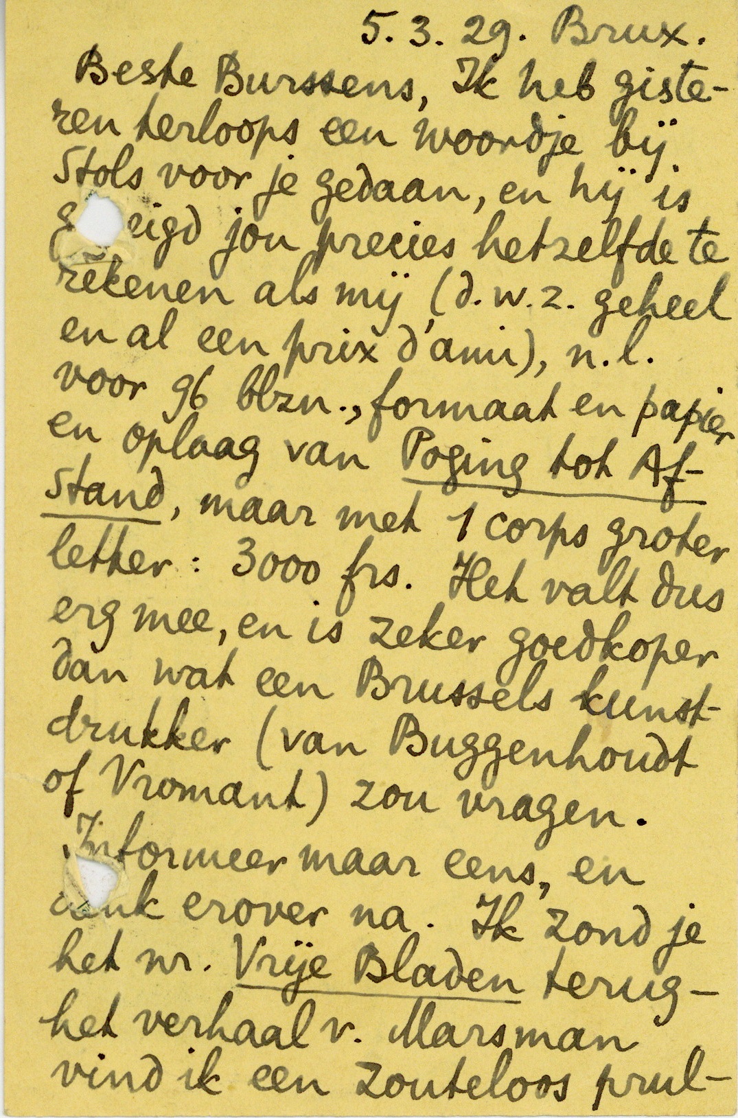 Beste Burssens, Ik heb gisteren terloops een woordje bij Stols voor je gedaan, en hij is geneigd jou precies hetzelfde te rekenen als mij (d.w.z. geheel en al een prix d'ami), n.l. voor 96 blzn., formaat en papier en oplaag van Poging tot Afstand, maar met 1 corps groter letter: 3000 frs. Het valt dus erg mee, en is zeker goedkoper dan wat een Brussels kunstdrukker (van Buggenhoudt of Vromant) zou vragen. Informeer maar eens, en denk erover na. Ik zond je het nr. Vrije Bladen terug - het verhaal v. Marsman546 vind ik een zouteloos prul - je twee bundels547 heb ik tot dusver niet ontvangen. Maar het is pas Dinsdagmorgen. Vanaf morgen is mijn adres: 13 rue Anoul (Ixelles); schrijf mij dus daarheen. Ik ga wschl. niet naar Gistoux!
