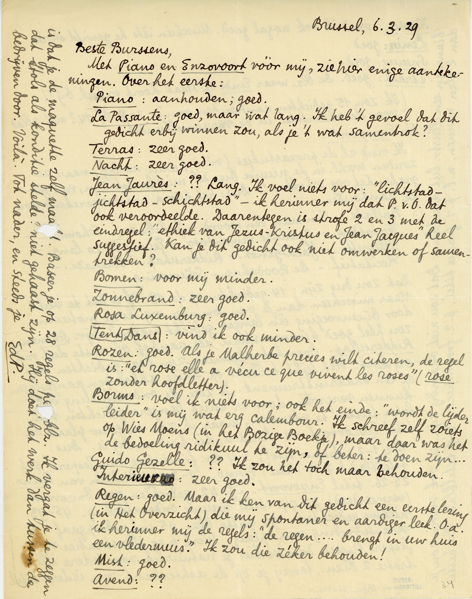 Jean Jaurès:?? Lang. Ik voel niets voor: ‘Lichtstad-jichtstad-schichtstad’ - ik herinner mij dat P.v.O. dat ook veroordeelde.548 Daarentegen is strofe 2 en 3 met de eindregel: ‘ethiek van Jezus-Kristus en Jean Jacques’ heel suggestief. Kan je dit gedicht ook niet omwerken of samentrekken?