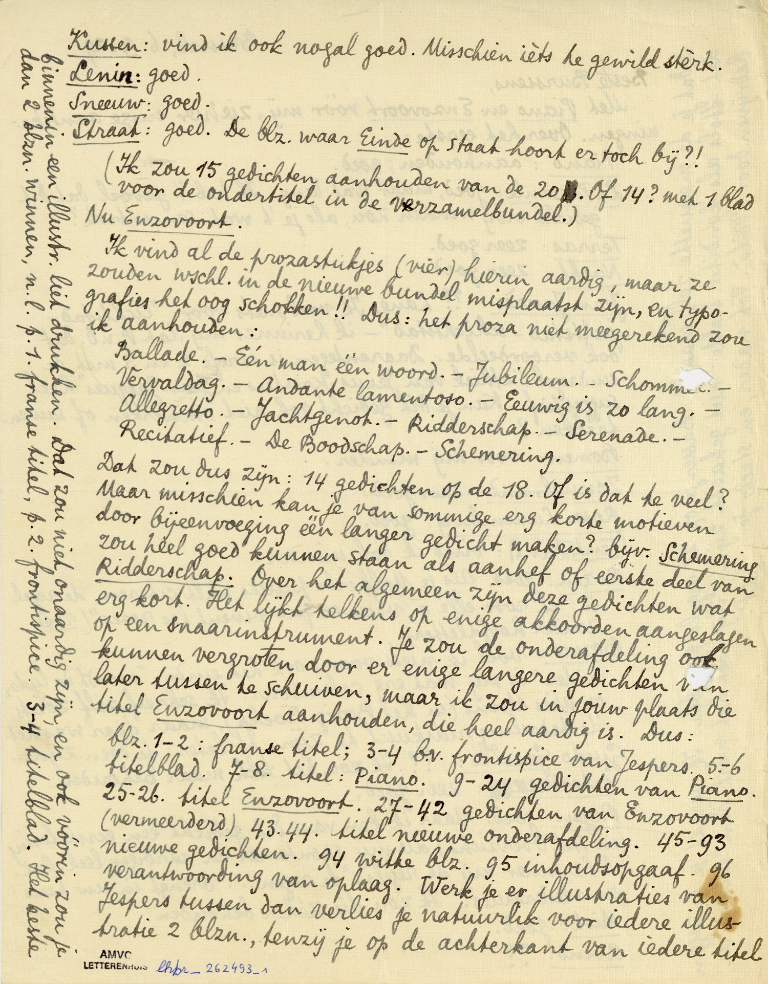 blz. 1-2: franse titel; 3-4 b.v. frontispice van Jespers. 5.-6 titelblad. 7-8. titel: Piano. 9-24 gedichten van Piano. 25-26. titel Enzovoort. 27-42 gedichten van Enzovoort (vermeerderd) 43.44. titel nieuwe onderafdeling. 45-93 nieuwe gedichten. 94 witte blz. 95 inhoudsopgaaf 96 verantwoording van oplaag. Werk je er illustraties van Jespers tussen dan verlies je natuurlik voor iedere illustratie 2 blzn., tenzij je op de achterkant van iedere titel binnenin een illustr. liet drukken. Dat zou niet onaardig zijn, en ook vóórin zou je dan 2 blzn. winnen, n.l. p.1. franse titel, p.2. frontispice. 3-4 titelblad. Het beste is dat je de maquette zelf maakt. Baseer je op 28 regels per blz. Ik vergat je te zeggen dat Stols als konditie stelde: niet gehaast zijn. Hij doet het werk dan tussen de bedrijven door. Voilà. Tot nader, en steeds je