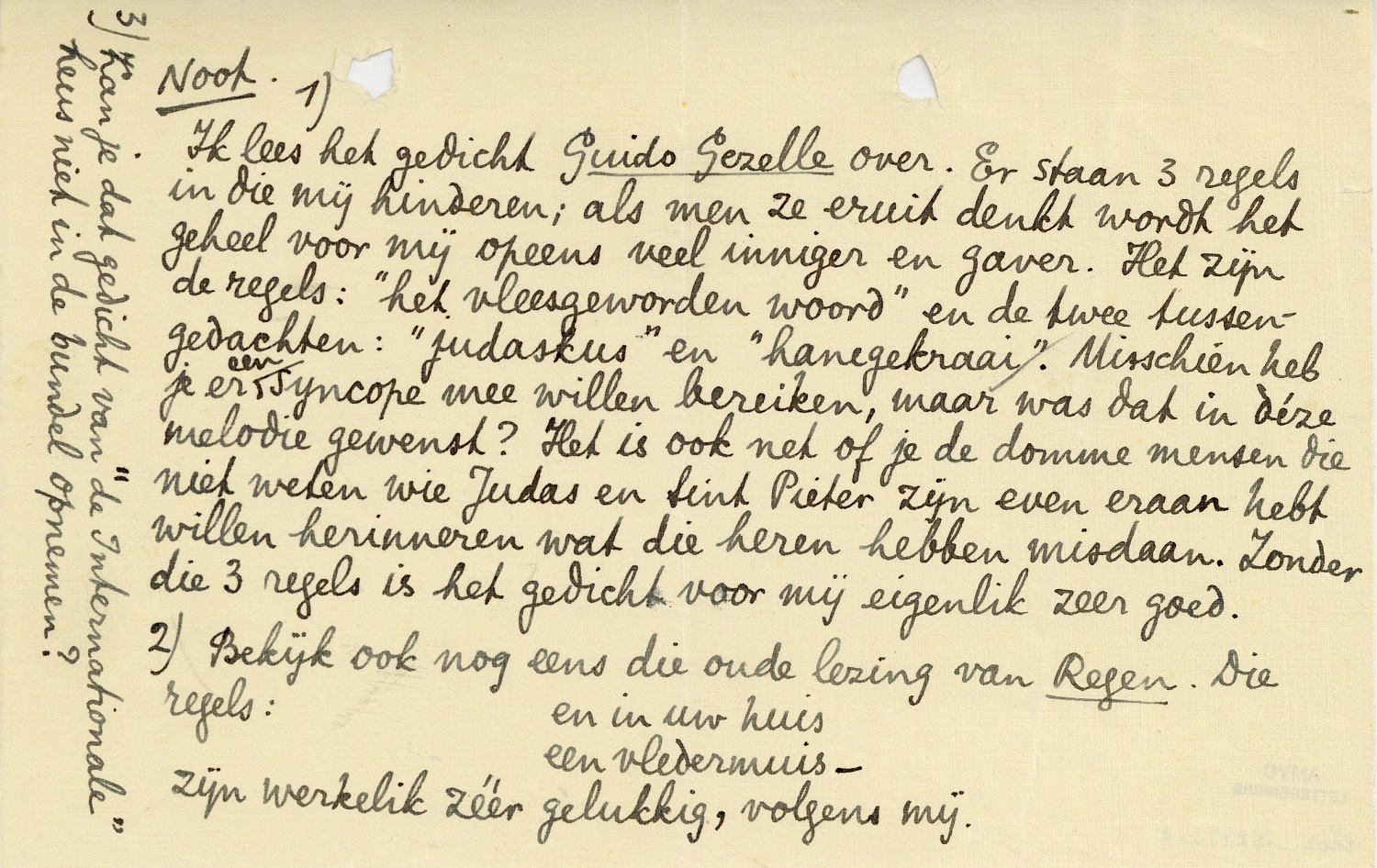 | 1) | Ik lees het gedicht Guido Gezelle over. Er staan 3 regels in die mij hinderen; als men ze eruit denkt wordt het geheel voor mij opeens veel inniger en gaver. Het zijn de regels: ‘het vleesgeworden woord’ en de twee tussengedachten: ‘judaskus’ en ‘hanegekraai’. Misschien heb je er een syncope mee willen bereiken, maar was dat in déze melodie gewenst? Het is ook net of je de domme mensen die niet weten wie Judas en Sint Pieter zijn even eraan hebt willen herinneren wat die heren hebben misdaan. Zonder die 3 regels is het gedicht voor mij eigenlik zeer goed. |