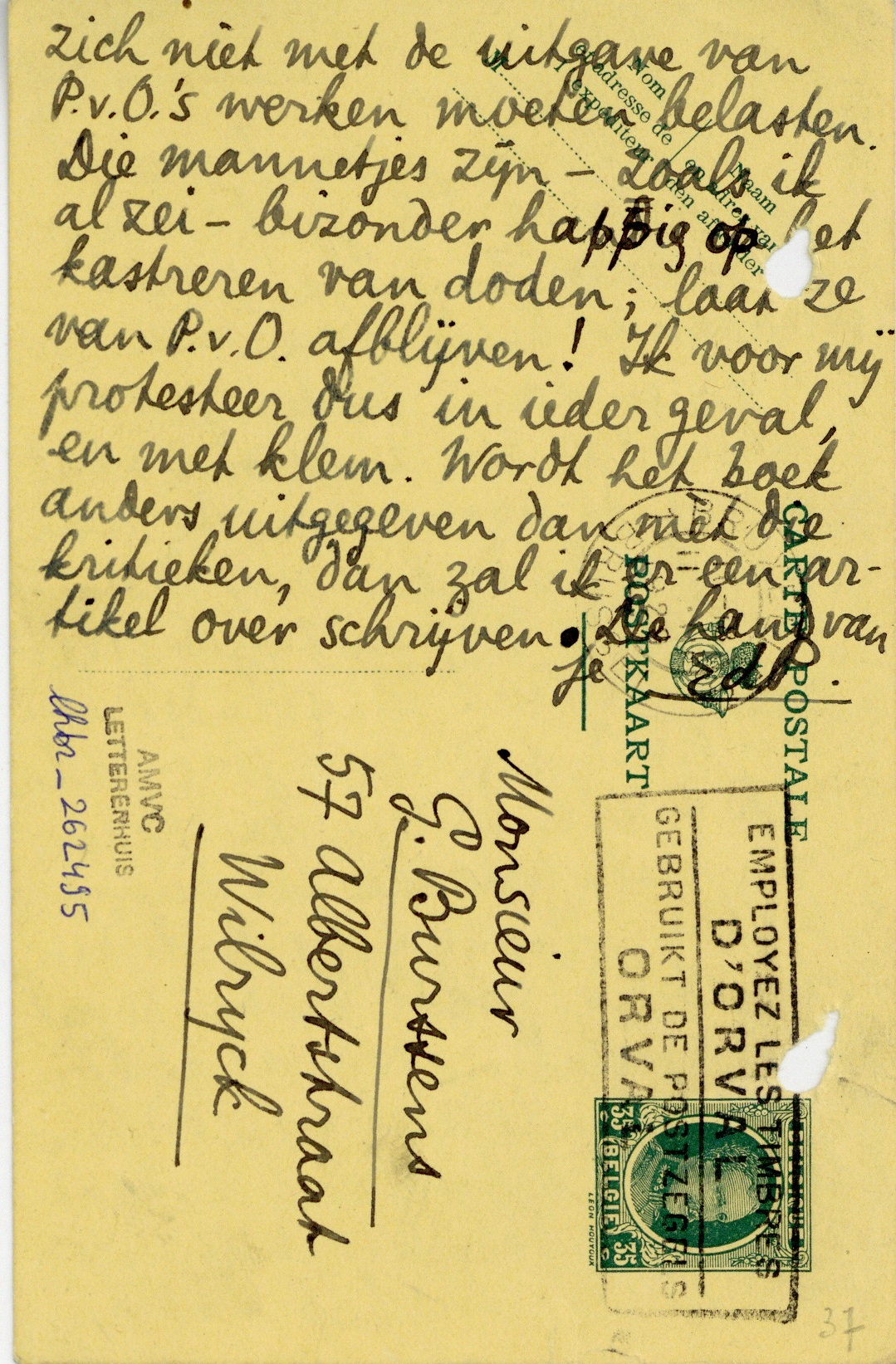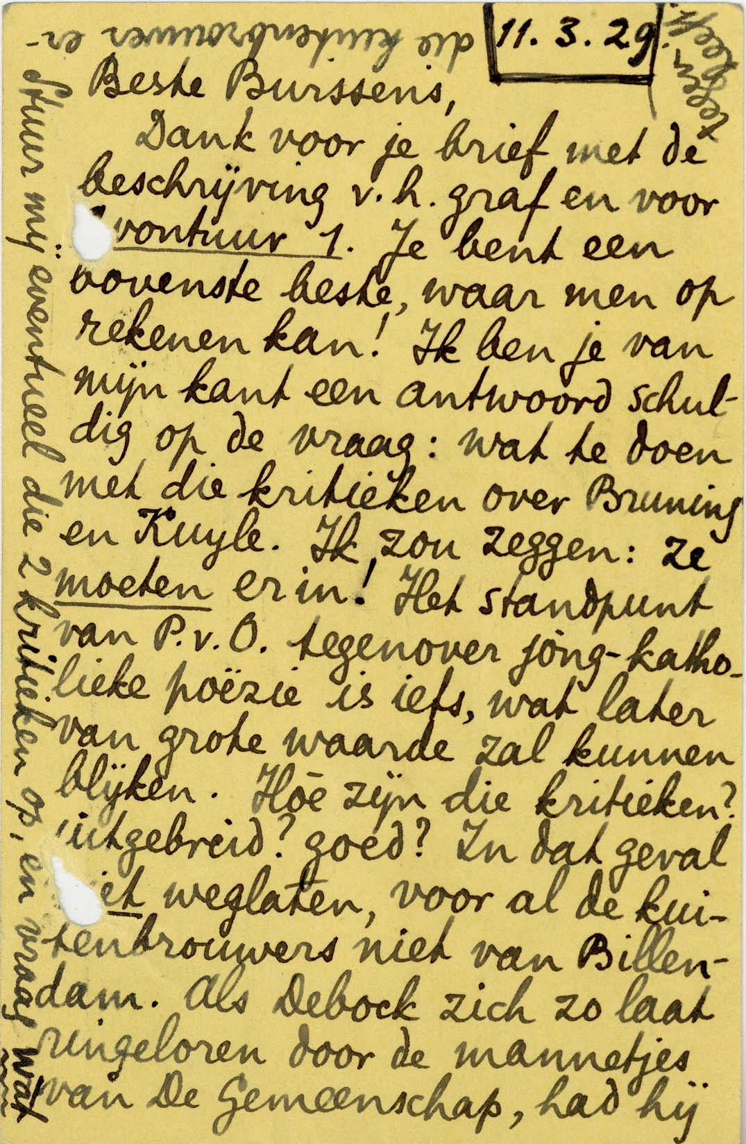 Dank voor je brief, met de beschrijving v.h. graf en voor Avontuur 1. Je bent een bovenste beste, waar men op rekenen kan! Ik ben je van mijn kant een antwoord schuldig op de vraag: wat te doen met die kritieken over Bruning en Kuyle. Ik zou zeggen: ze moeten er in! Het standpunt van P.v.O. tegenover jong-katholieke poëzie is iets, wat later van grote waarde zal kunnen blijken. Hoè zijn die kritieken? uitgebreid? goed? In dat geval niet weglaten, voor al de kuitenbrouwers niet van Billendam. Als Debock zich zo laat ringeloren door de mannetjes van De Gemeenschap, had hij zich niet met de uitgave van P.v.O.'s werken moeten belasten. Die mannetjes zijn - zoals ik al zei - bizonder happig op het kastreren van doden; laat ze van P.v.O. afblijven! Ik voor mij protesteer dus in ieder geval, en met klem. Wordt het boek anders uitgegeven dan mèt die kritieken, dan zal ik er een artikel over schrijven.558 De hand van je