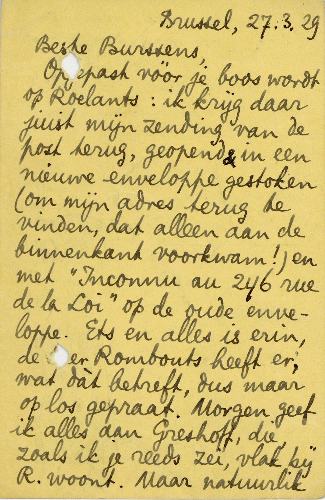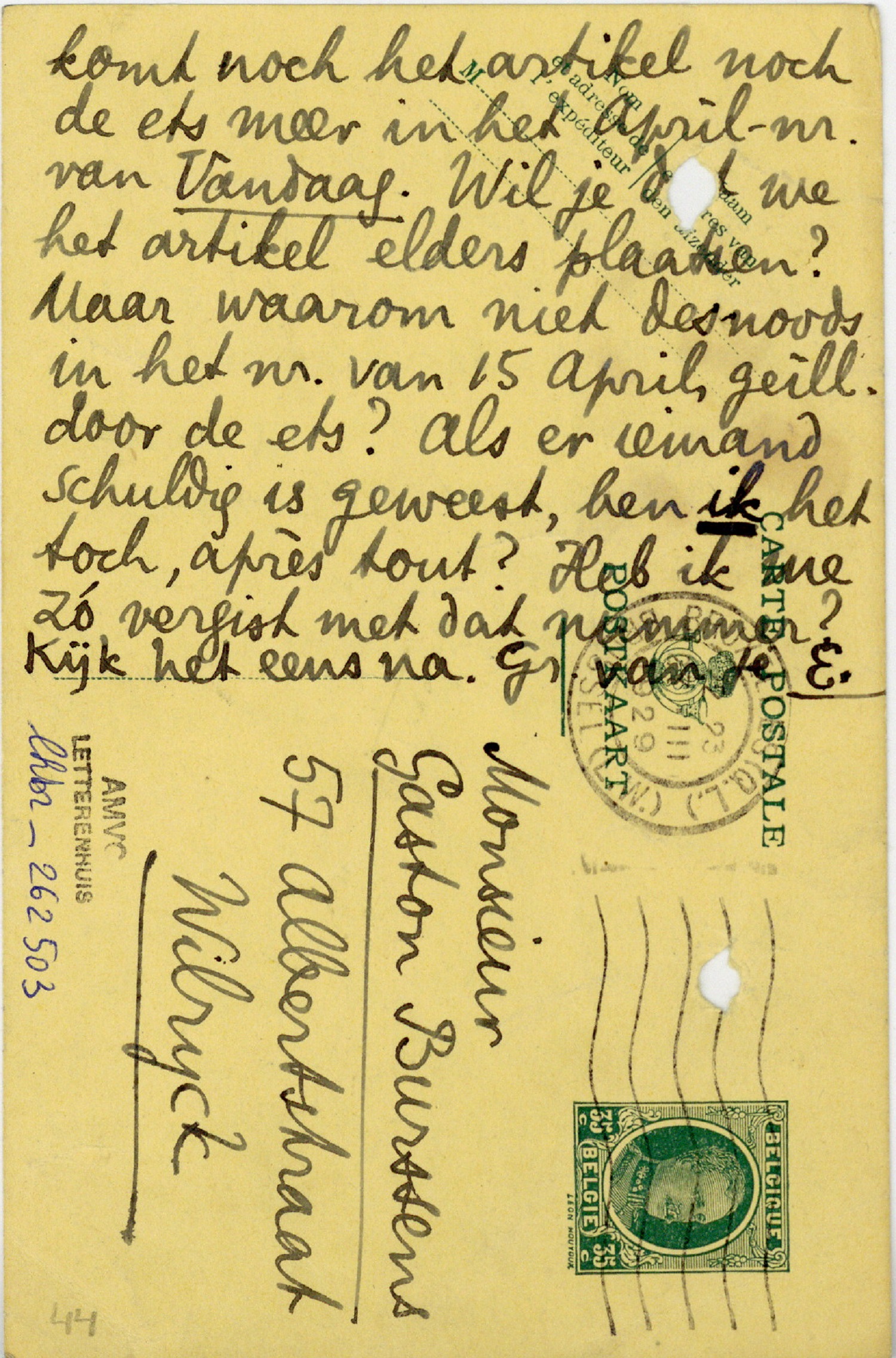 Opgepast vóór je boos wordt op Roelants: ik krijg daar juist mijn zending van de post terug, geopend & in een nieuwe enveloppe gestoken (om mijn adres terug te vinden, dat alleen aan de binnenkant voorkwam!) en met ‘Inconnu au 246 rue de la Loi’ op de oude enveloppe. Ets en alles is erin, de heer Rom bouts heeft er, wat dàt betreft, dus maar op los gepraat. Morgen geef ik alles aan Greshoff, die, zoals ik je reeds zei, vlak bij R. woont. Maar natuurlik komt noch het artikel noch de ets meer in het April-nr. van Vandaag. Wil je dat we het artikel elders plaatsen? Maar waarom niet desnoods in het nr. van 15 April, geill. door de ets? Als er iemand schuldig is geweest, ben ik het toch, après tout? Heb ik me zó vergist met dat nummer? Kijk het eens na. Gr. van je