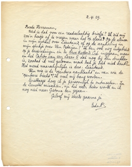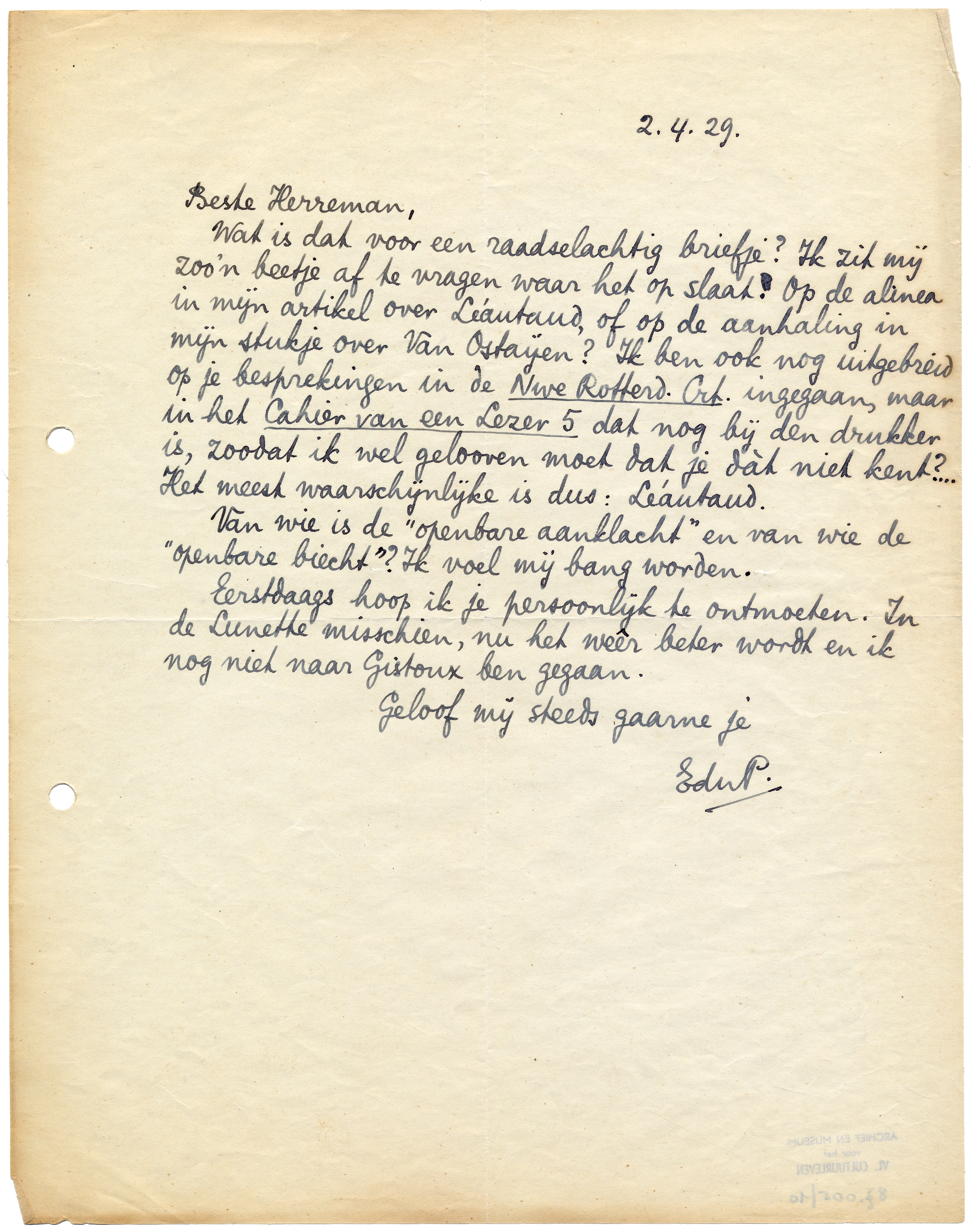 Wat is dat voor een raadselachtig briefje? Ik zit mij zoo'n beetje af te vragen waar het op slaat? Op de alinea in mijn artikel over Léau-taud,577 of op de aanhaling in mijn stukje over Van Ostaijen? Ik ben ook nog uitgebreid op je besprekingen in de Nwe Rotterd. Crt. ingegaan,578 maar in het Cahier van een Lezer 5 dat nog bij den drukker is, zoodat ik wel gelooven moet dat je dàt niet kent?... Het meest waarschijnlijke is dus: Léautaud.