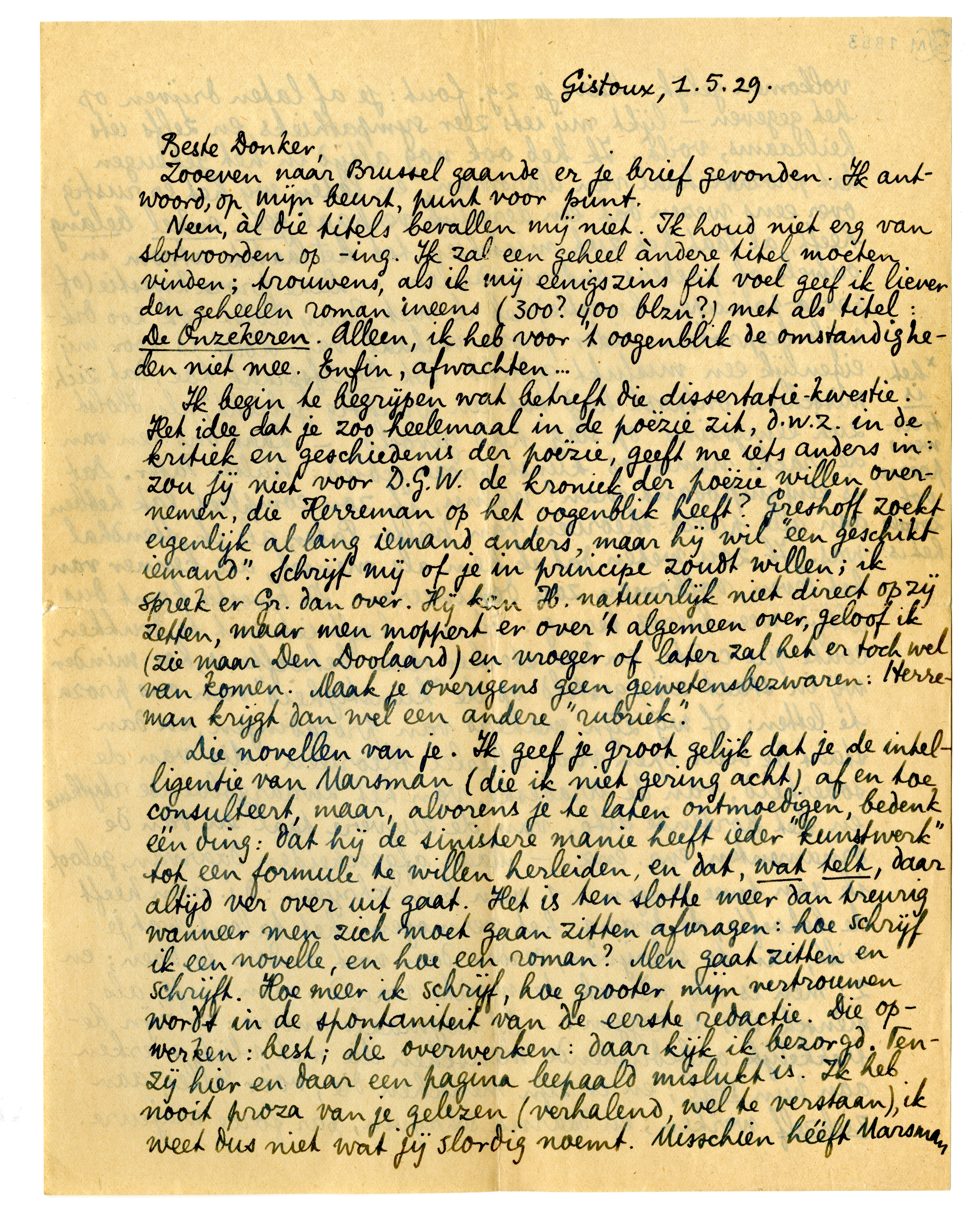 Ik begin te begrijpen wat betreft die dissertatie-kwestie. Het idee dat je zoo heelemaal in de poëzie zit, d.w.z. in de kritiek en geschiedenis der poëzie, geeft me iets anders in: zou jij niet voor D.G.W. de kroniek der poëzie willen overnemen, die Herreman op het oogenblik heeft?592 Greshoff zoekt eigenlijk al lang iemand anders, maar hij wil ‘een geschikt iemand’. Schrijf mij of je in principe zoudt willen; ik spreek er Gr. dan over. Hij kan H. natuurlijk niet direct opzij zetten, maar men moppert er over 't algemeen over, geloof ik (zie maar Den Doolaard) en vroeger of later zal het er toch wel van komen. Maak je overigens geen gewetensbezwaren: Herreman krijgt dan wel een andere ‘rubriek’.