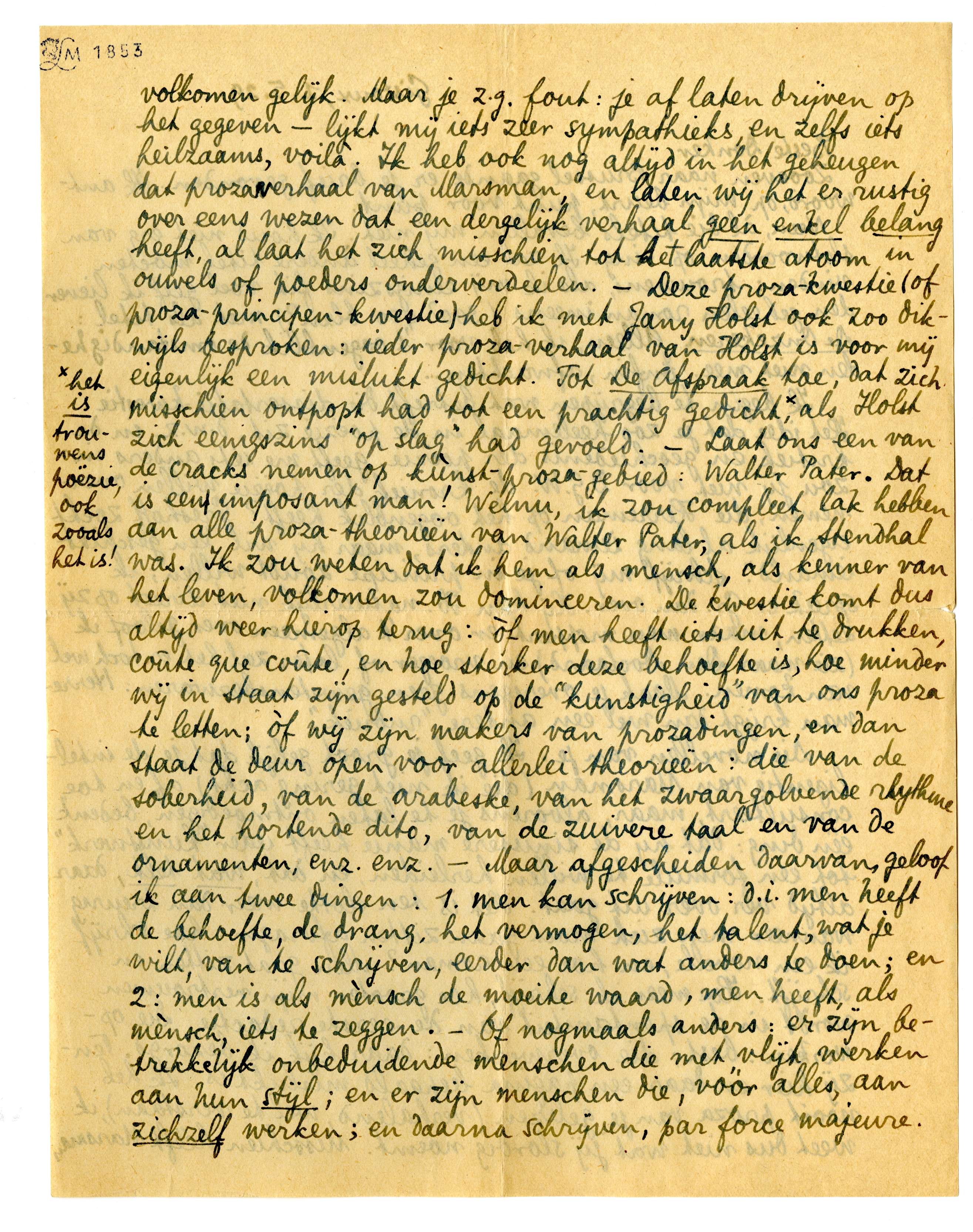 Die novellen van je. Ik geef je groot gelijk dat je de intelligentie van Marsman (die ik niet gering acht) af en toe consulteert, maar, alvorens je te laten ontmoedigen, bedenk één ding: dat hij de sinistere manie heeft ieder ‘kunstwerk’ tot een formule te willen herleiden, en dat, wat telt, daar altijd ver over uit gaat. Het is ten slotte meer dan treurig wanneer men zich moet gaan zitten afvragen: hoe schrijf ik een novelle, en hoe een roman? Men gaat zitten en schrijft. Hoe meer ik schrijf, hoe grooter mijn vertrouwen wordt in de spontaniteit van de eerste redactie. Die opwerken: best; die overwerken: daar kijk ik bezorgd. Tenzij hier en daar een pagina bepaald mislukt is. Ik heb nooit proza van je gelezen (verhalend, wel te verstaan), ik weet dus niet wat jij slordig noemt. Misschien hééft Marsman volkomen gelijk. Maar je z.g. fout: je aflaten drijven op het gegeven-lijkt mij iets zeer sympathieks, en zelfs iets heilzaams, voilà. Ik heb ook nog altijd in het geheugen dat prozaverhaal van Marsman, en laten wij het er rustig over eens wezen dat een dergelijk verhaal geen enkel belang heeft, al laat het zich misschien tot het laatste atoom in ouwels of poeders onderverdeelen. - Deze proza-kwestie (of prozaprincipen-kwestie) heb ik met Jany Holst ook zoo dikwijls besproken: ieder prozaverhaal van Holst is voor mij eigenlijk een mislukt gedicht. Tot De Afspraak toe, dat zich misschien ontpopt had tot een prachtig gedicht,* als Holst zich eenigszins ‘op slag’ had gevoeld. - Laat ons een van de cracks nemen op kùnst-prozagebied: Walter Pater. Dat is een imposant man! Welnu, ik zou compleet lak hebben aan alle proza-theorieën van Walter Pater, als ik Stendhal was. Ik zou weten dat ik hem als mensch, als kenner van het leven, volkomen zou domineeren. De kwestie komt dus altijd weer hierop terug: òf men heeft iets uit te drukken, coûte que coûte, en hoe sterker deze behoefte is, hoe minder wij in staat zijn gesteld op de ‘kunstigheid’ van ons proza te letten; òf wij zijn makers van prozadingen, en dan staat de deur open voor allerlei theorieën: die van de soberheid, van de arabeske, van het zwaargolvende rhythme en het hortende dito, van de zuivere taal en van de ornamenten, enz. enz. - Maar afgescheiden daarvan, geloof ik aan twee dingen: 1. men kan schrijven: d.i. men heeft de behoefte, de drang, het vermogen, het talent, wat je wilt, van te schrijven, eerder dan wat anders te doen; en 2: men is als mènsch de moeite waard, men heeft, als mènsch, iets te zeg-gen. - Of nogmaals anders: er zijn betrekkelijk onbeduidende menschen die met vlijt werken aan hun stijl; en er zijn menschen die, vóór alles, aan zichzelf werken; en daarna schrijven, par force majeure.