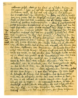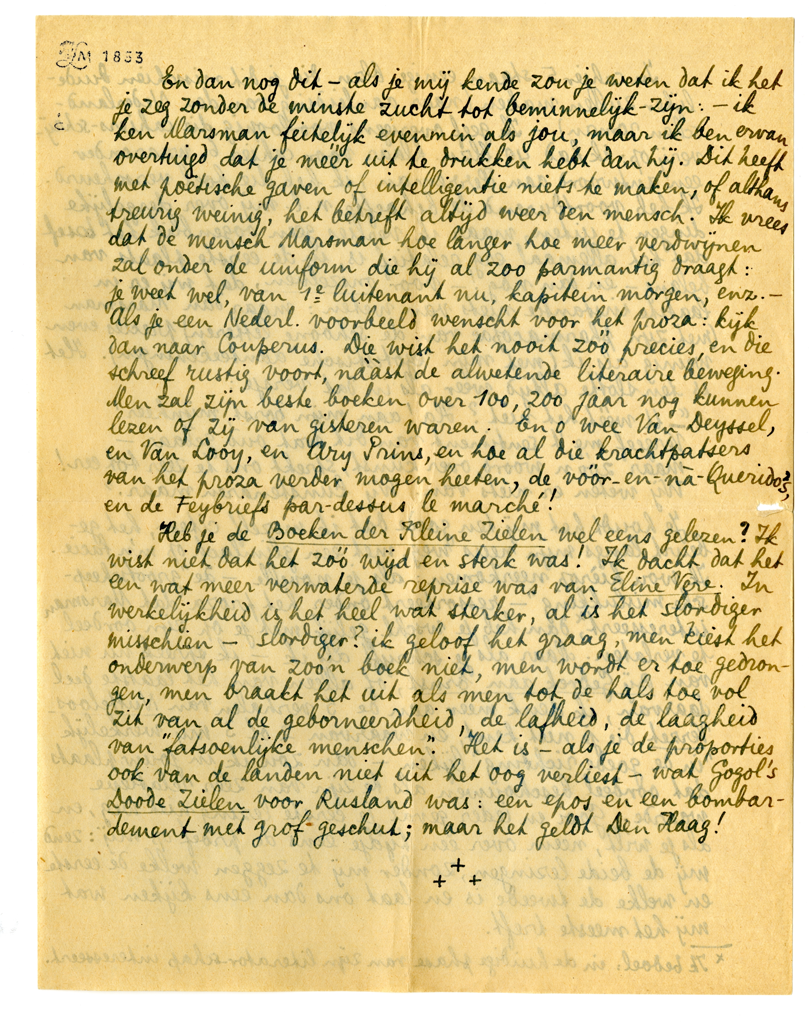 Heb je de Boeken der Kleine Zielen wel eens gelezen? Ik wist niet dat het zóó wijd en sterk was! Ik dacht dat het een wat meer verwaterde reprise was van Eline Vere. In werkelijkheid is het heel wat sterker, al is het slordiger misschien - slordiger? ik geloof het graag, men kiest het onderwerp van zoo'n boek niet, men wordt er toe gedrongen, men braakt het uit als men tot de hals toe vol zit van al de geborneerdheid, de lafheid, de laagheid van ‘fatsoenlijke menschen’. Het is - als je de proporties ook van de landen niet uit het oog verliest-wat Gogol's Doode Zielen voor Rusland was: een epos en een bombardement met grof geschut; maar het geldt Den Haag!