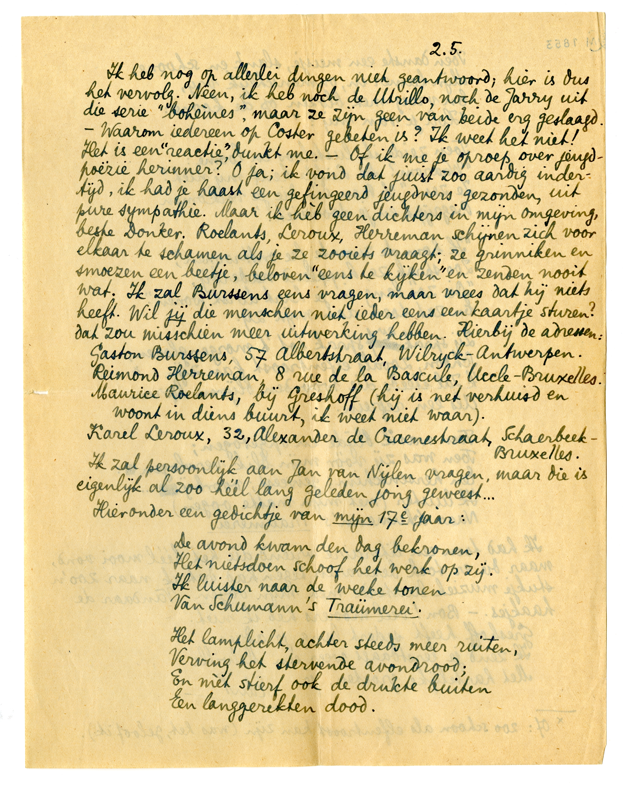 Gaston Burssens, 57 Albertstraat, Wilryck-Antwerpen. Reimond Herreman, 8 rue de la Bascule, Uccle-Bruxelles. Maurice Roelants, bij Greshoff (hij is net verhuisd en woont in diens buurt, ik weet niet waar).