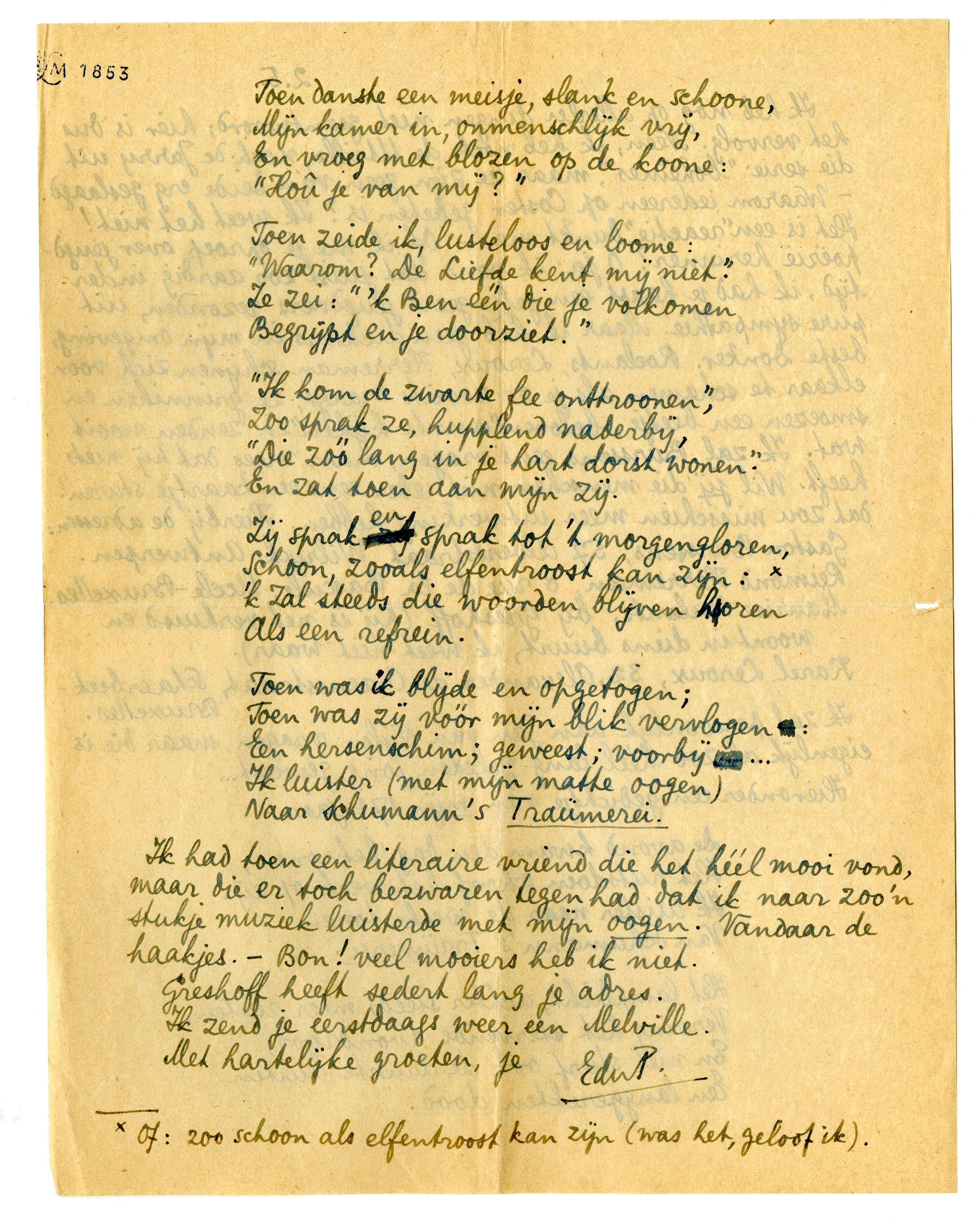 Ik had toen een literaire vriend die het héél mooi vond, maar die er toch bezwaren tegen had dat ik naar zoo'n stukje muziek luisterde met mijn oogen. Vandaar de haakjes. - Bon! Veel mooiers heb ik niet.