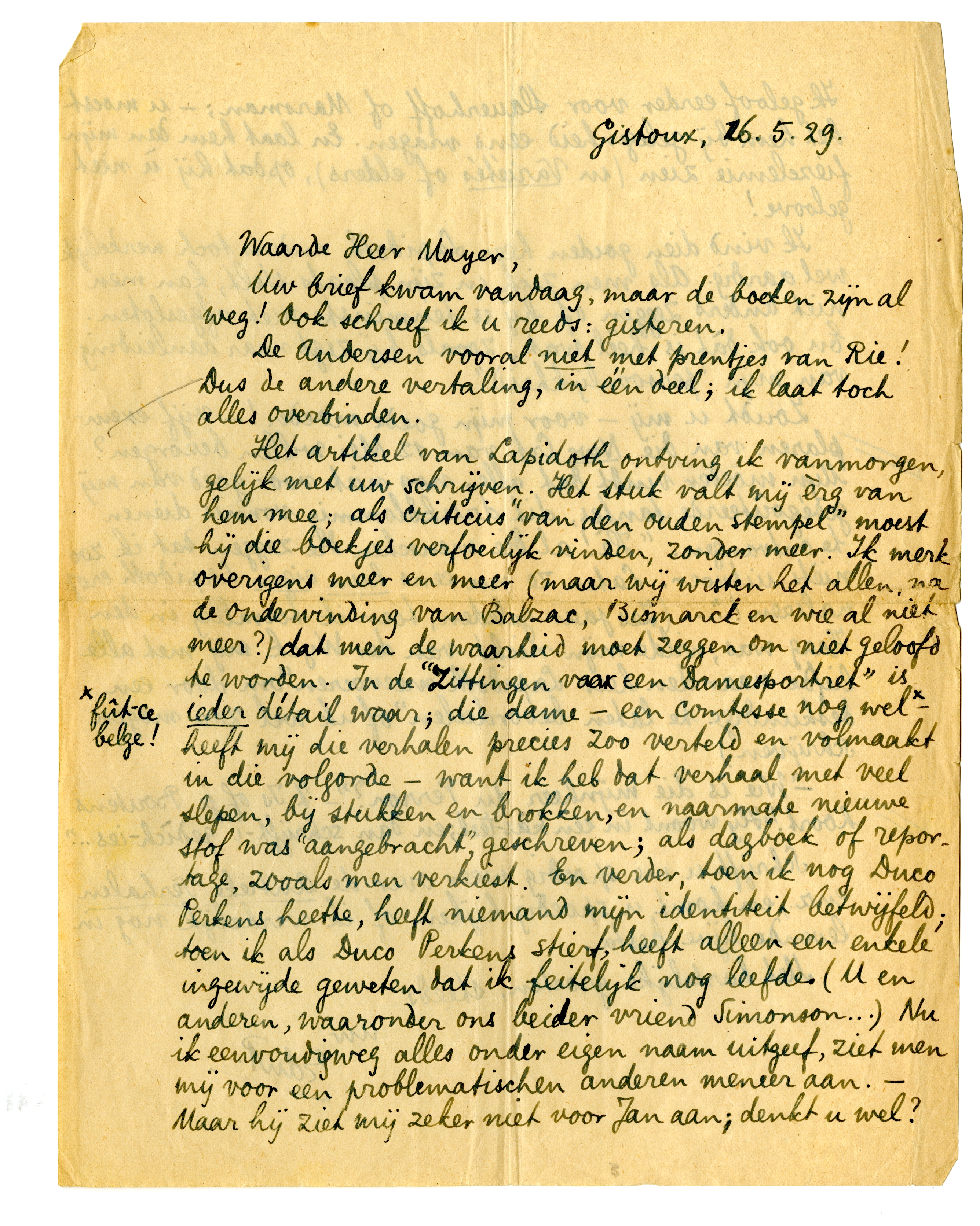 Het artikel van Lapidoth606 ontving ik vanmorgen, gelijk met uw schrijven. Het stuk valt mij èrg van hem mee; als criticus ‘van den ouden stempel’ moest hij die boekjes verfoeilijk vinden, zonder meer. Ik merk overigens meer en meer (maar wij wisten het allen, na de ondervinding van Balzac, Bismarck en wie al niet meer?) dat men de waarheid moet zeggen om niet geloofd te worden. In de ‘Zittingen voor een Damesportret’ is ieder détail waar; die dame-een comtesse607 nog wel*-heeft mij die verhalen precies zoo verteld en volmaakt in die volgorde-want ik heb dat verhaal met veel slepen, bij stukken en brokken, en naarmate nieuwe stof was ‘aangebracht’, geschreven; als dagboek of reportage, zooals men verkiest. En verder, toen ik nog Duco Perkens heette, heeft niemand mijn identiteit betwijfeld; toen ik als Duco Perkens stierf, heeft alleen een enkele ingewijde geweten dat ik feitelijk nog leefde. (U en anderen, waaronder ons beider vriend Simonson...608) Nu ik eenvoudigweg alles onder eigen naam uitgeef, ziet men mij voor een problematischen anderen meneer aan. - Maar hij ziet mij zeker niet voor Jan aan; denkt u wel? Ik geloof eerder voor Slauerhoff of Marsman;-u moest het hem bij gelegenheid eens vragen. En laat hem dan mijn fiezelemie zien (in Variétés of elders), opdat hij ù niet geloove!
