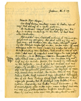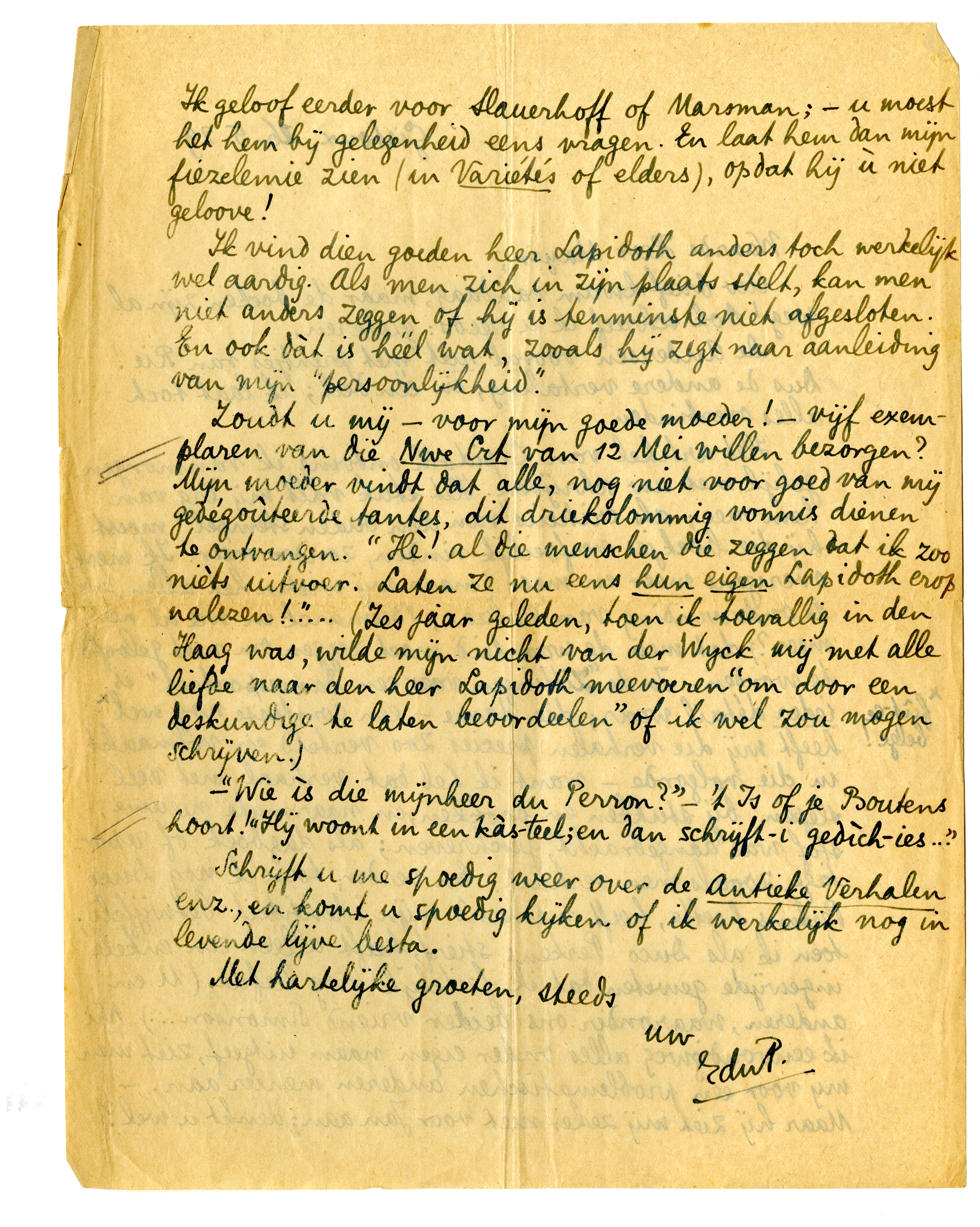 Zoudt u mij-voor mijn goede moeder!-vijf exemplaren van die Nwe Crt van 12 Mei willen bezorgen? Mijn moeder vindt dat alle, nog niet voor goed van mij gedégoûteerde tantes, dit driekolommig vonnis dienen te ontvangen. ‘Hè! al die menschen die zeggen dat ik zoo nièts uitvoer. Laten ze nu eens hun eigen Lapidoth erop nalezen!’..... (Zes jaar geleden, toen ik toevallig in den Haag was, wilde mijn nicht van der Wyck mij met alle liefde naar den heer Lapidoth meevoeren ‘om door een deskundige te laten beoordeelen’ of ik wel zou mogen schrijven.)