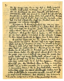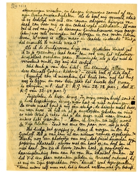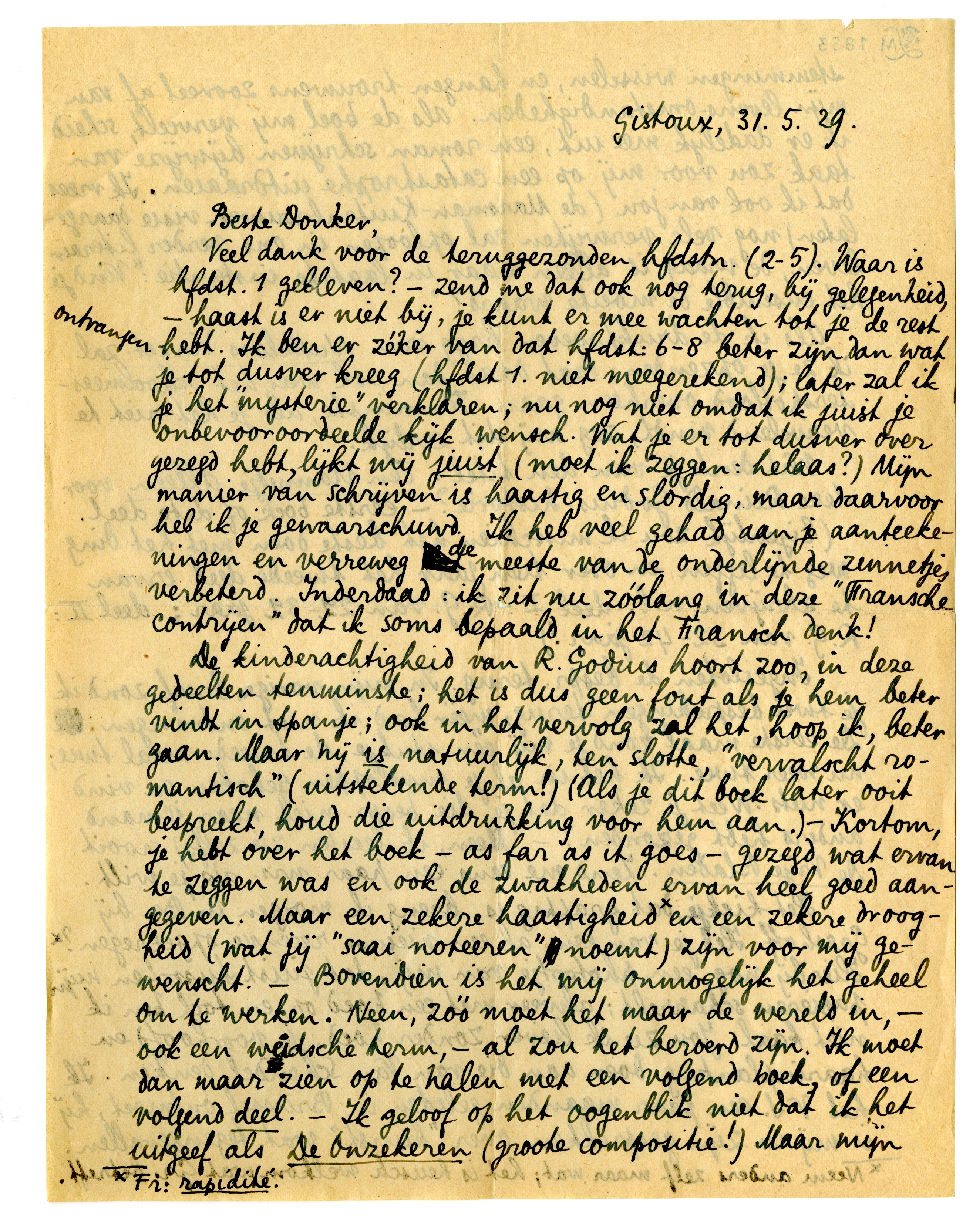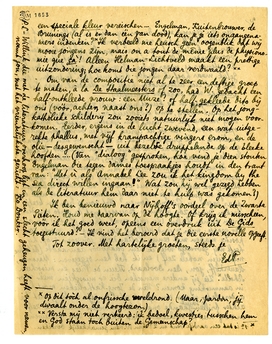 Veel dank voor de teruggezonden hfdstn. (2-5). Waar is hfdst. 1 gebleven?-zend me dat ook nog terug, bij gelegenheid,-haast is er niet bij, je kunt er mee wachten tot je de rest ontvangen hebt. Ik ben er zéker van dat hfdst. 6-8 beter zijn dan wat je tot dusver kreeg (hfdst 1. niet meegerekend); later zal ik je het ‘mysterie’ verklaren; nu nog niet omdat ik juist je onbevooroordeelde kijk wensch. Wat je er tot dusver over gezegd hebt, lijkt mij juist (moet ik zeggen: helaas?) Mijn manier van schrijven is haastig en slordig, maar daarvoor heb ik je gewaarschuwd. Ik heb veel gehad aan je aanteekeningen en verreweg de meeste van de onderlijnde zinnetjes verbeterd. Inderdaad: ik zit nu zóólang in deze ‘Fransche contrijen’ dat ik soms bepaald in het Fransch denk!