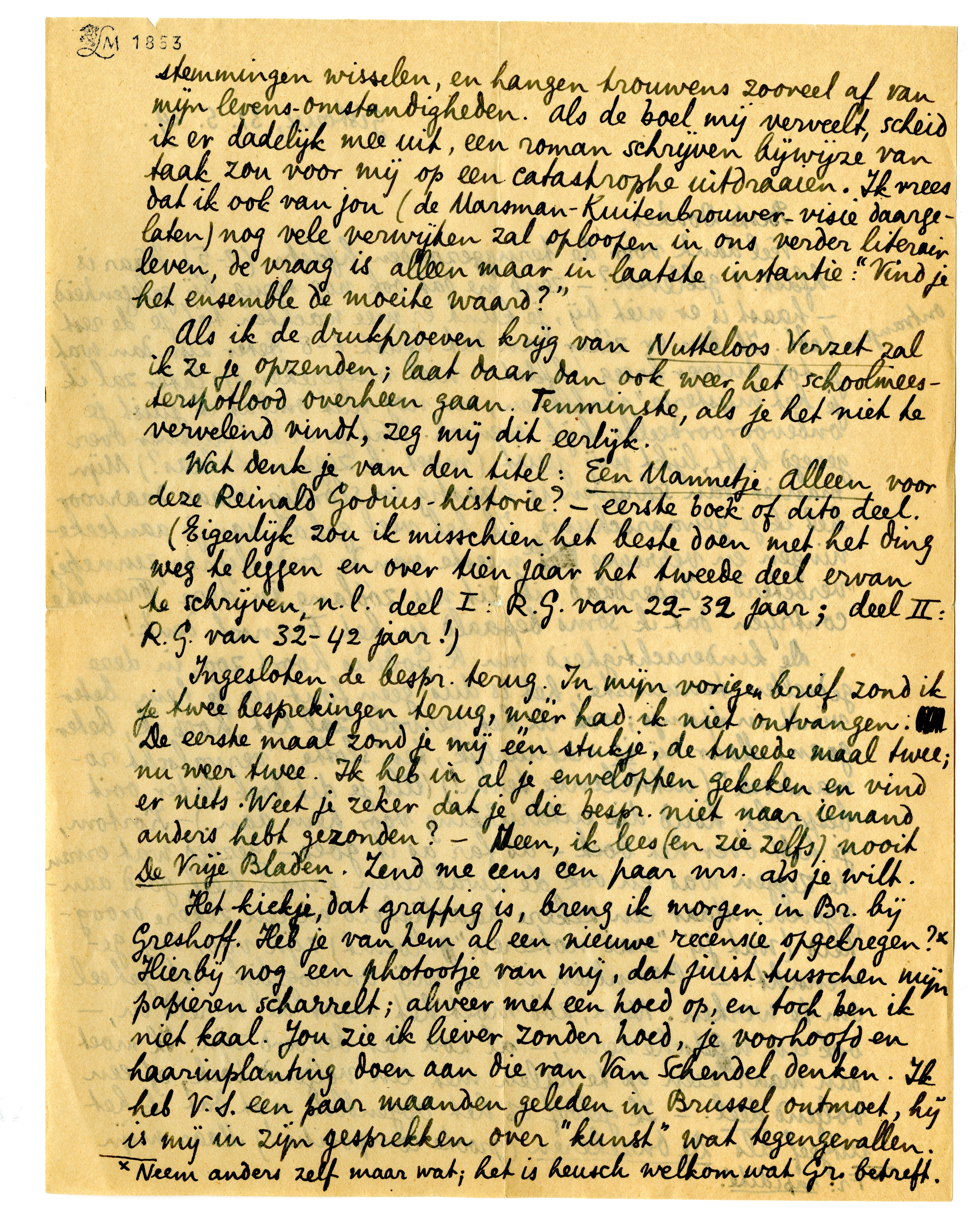 Het kiekje, dat grappig is, breng ik morgen in Br. bij Greshoff. Heb je van hem al een nieuwe recensie opgekregen?* Hierbij nog een photootje van mij, dat juist tusschen mijn papieren scharrelt; alweer met een hoed op, en toch ben ik niet kaal. Jou zie ik liever zonder hoed, je voorhoofd en haarinplanting doen aan die van Van Schendel denken. Ik heb V.S. een paar maanden geleden in Brussel ontmoet,622 hij is mij in zijn gesprekken over ‘kunst’ wat tegengevallen. Van den eenigen man die in zijn tijd in Holland wat te vertellen heeft gehad, verdraagt men niet goed dat hij aan een kunstwerk een paar bepaalde, wat bekrompen voorwaarden stelt. Als iemand me vertelt dat Stendhal geen kunstenaar is, maar Julien Green wel, geef ik hem desnoods gelijk, maar hoef ik verder niet met hem te praten. (Niet dat V.S. zich uitgesproken heeft over Stendhal, maar het principe was ongeveer hetzelfde.)