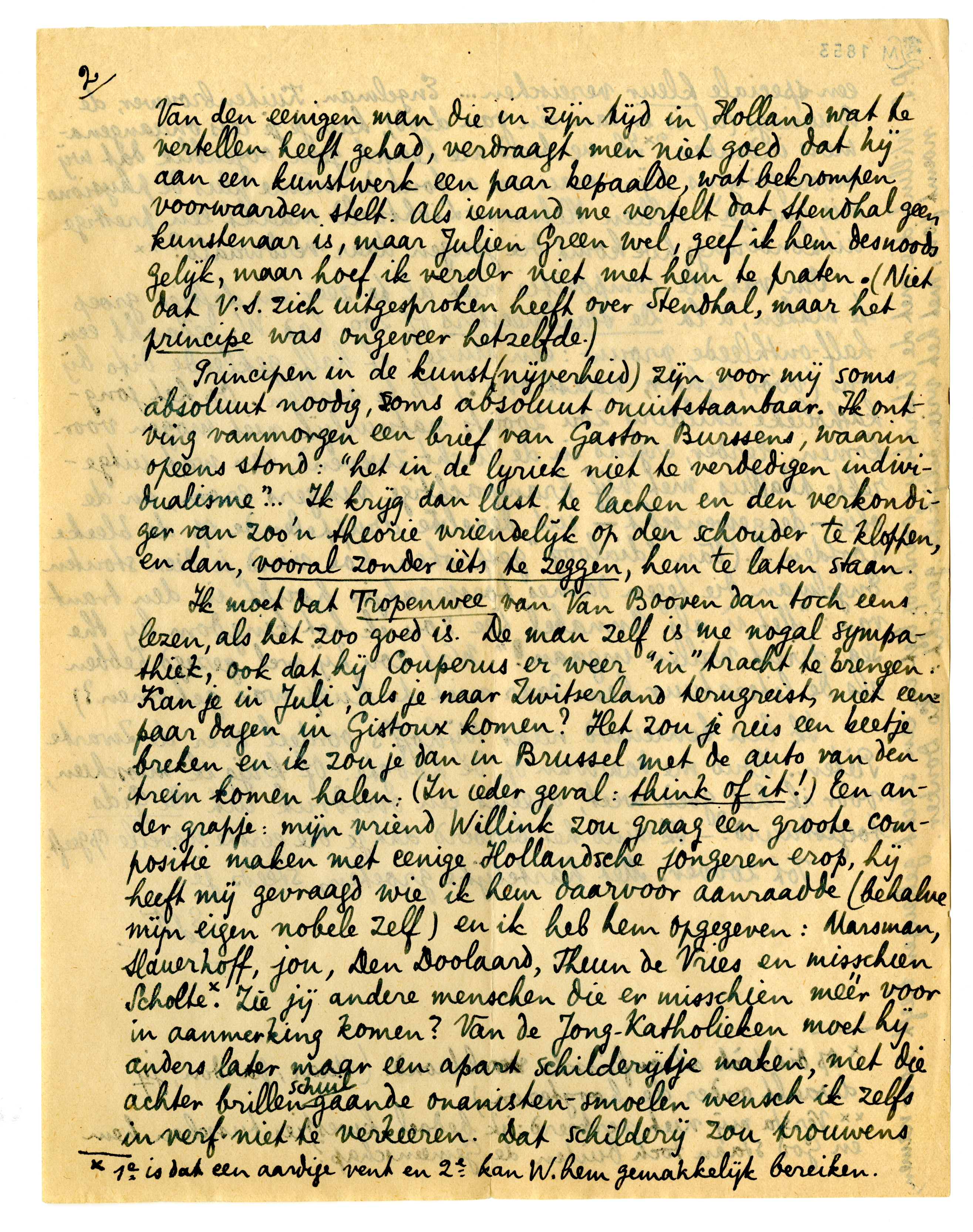 Ik moet dat Tropenwee van Van Booven dan toch eens lezen, als het zoo goed is. De man zelf is me nogal sympathiek, ook dat hij Couperus er weer ‘in’ tracht te brengen.623 Kan je in Juli, als je naar Zwitserland terugreist, niet een paar dagen in Gistoux komen? Het zou je reis een beetje breken en ik zou je dan in Brussel met de auto van den trein komen halen. (In ieder geval: think of it!) Een ander grapje: mijn vriend Willink zou graag een groote compositie maken met eenige Hollandsche jongeren erop, hij heeft mij gevraagd wie ik hem daarvoor aanraadde (behalve mijn eigen nobele zelf) en ik heb hem opgegeven: Marsman, Slauerhoff, jou, Den Doolaard, Theun de Vries en misschien Scholte.* Zie jij andere menschen die er misschien méér voor in aanmerking komen? Van de Jong-Katholieken moet hij anders later maar een apart schilderijtje maken, met die achter brillen schuilgaande onanisten-smoelen wensch ik zelfs in verf niet te verkeeren. Dat schilderij zou trouwens een speciale kleur vereischen... Engelman, Kuitenbrouwer, de Brunings (al is er dan één van dood), kan je je iets onaangenamers indenken?624 Ik verbeeld me heusch geen oogenblik dat wij mooie jongens zijn, mais on a tout de même plus de physionomie que ça! Alleen Helman-Lichtveld maakt een prettige uitzondering; hoe komt die jongen daar verdwaald?625