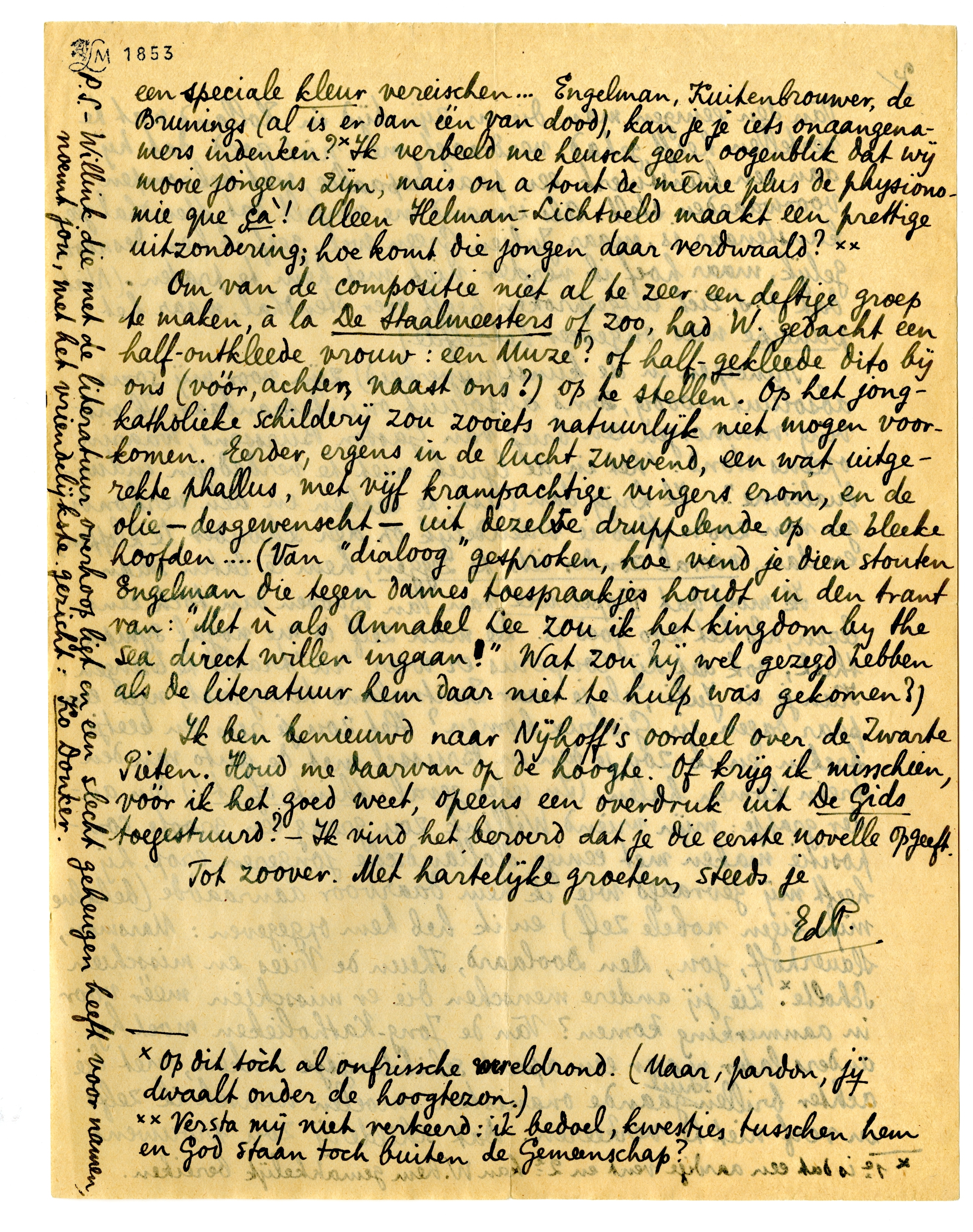 Om van de compositie niet al te zeer een deftige groep te maken, à la De Staalmeesters of zoo, had W. gedacht een half-ontkleede vrouw: een Muze? of half-gekleede dito bij ons (vóór, achter, naast ons?) op te stellen. Op het jong-katholieke schilderij zou zooiets natuurlijk niet mogen voorkomen. Eerder, ergens in de lucht zwevend, een wat uitgerekte phallus, met vijf krampachtige vingers erom, en de olie-desgewenscht-uit dezelve druppelende op de bleeke hoofden.... (Van ‘dialoog’ gesproken, hoe vind je dien stouten Engelman die tegen dames toespraakjes houdt in den trant van: ‘Met ù als Annabel Lee zou ik het kingdom by the sea direct willen in-gaan!’626 Wat zou hij wel gezegd hebben als de literatuur hem daar niet te hulp was gekomen?)