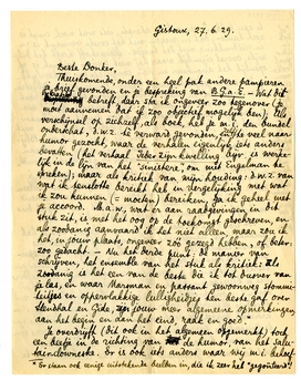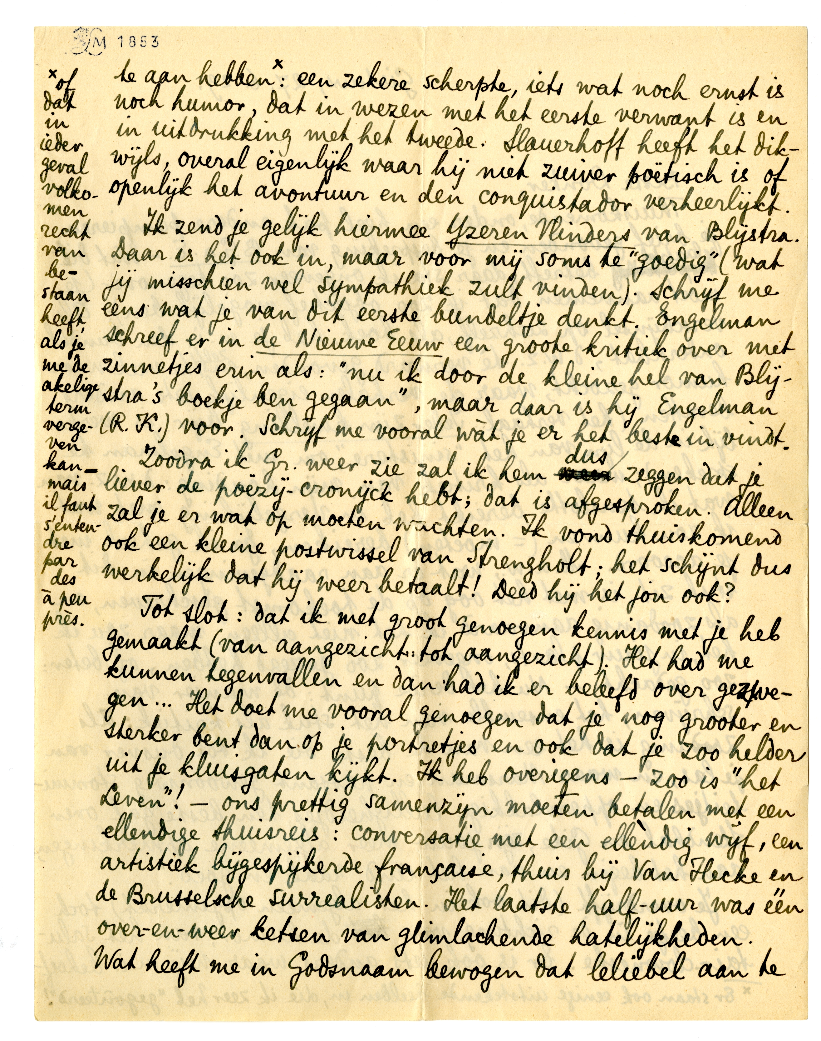 Thuiskomende, onder een heel pak andere pampieren je brief gevonden en je bespreking van B.G.a.E.643-Wat dit laatste betreft, daar sta ik ongeveer zoo tegenover (je moet aannemen dat ik zoo objectief mogelijk ben): Als verschijnsel op zichzelf, als boek, heb je m.i. den bundel onderschat, d.w.z. tè verward gevonden, en zelf te veel naar humor gezocht, waar de verhalen eigenlijk iets anders bevatten (het verhaal Ieder zijn kwelling bijv. is werkelijk in de lijn van het ‘sinistere’, om met Engelman te spreken); maar als kritiek van mijn houding: d.w.z. van wat ik tenslotte bereikt heb in vergelijking met wat ik zou kunnen (=moeten) bereiken, ga ik geheel met je accoord. M.a.w., wat er aan raadgevingen in dit stuk zit, is met het oog op de toekomst geschreven, en als zoodanig aanvaard ik het niet alleen, maar zou ik het, in jouw plaats, ongeveer zóó gezegd hebben, of beter: zoo gedacht. - Nu het derde punt: de manier van schrijven, het ensemble van het stuk als kritiek: als zoodanig is het een van de beste die ik tot dusver van je las, en waar Marsman en passant gewoonweg stommiteitjes en oppervlakkige lulligheidjes ten beste gaf over Stendhal en Gide, zijn jouw meer algemeene opmerkingen, aan het begin en aan het eind, raak en goed.*