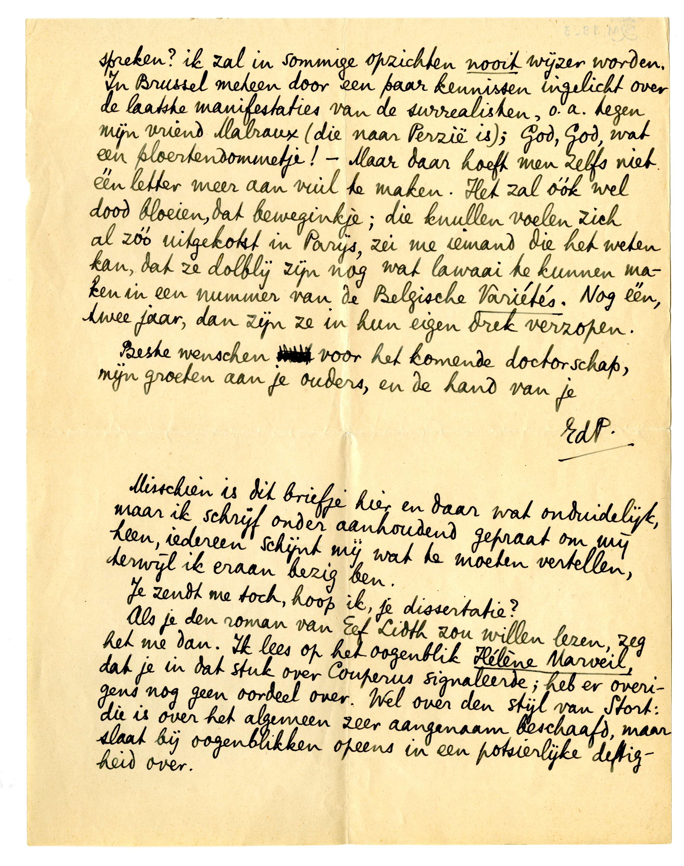 Tot slot: dat ik met groot genoegen kennis met je heb gemaakt (van aangezicht tot aangezicht646). Het had me kunnen tegenvallen en dan had ik er beleefd over gezwegen... Het doet me vooral genoegen dat je nog grooter en sterker bent dan op je portretjes en ook dat je zoo helder uit je kluisgaten kijkt. Ik heb overigens-zoo is ‘het Leven’!-ons prettig samenzijn moeten betalen met een ellendige thuisreis: conversatie met een ellèndig wijf, een artistiek bijgespijkerde française, thuis bij Van Hecke en de Brusselsche surrealisten. Het laatste half-uur was één over-en-weer ketsen van glimlachende hatelijkheden. Wat heeft me in Godsnaam bewogen dat leliebel aan te spreken? ik zal in sommige opzichten nooit wijzer worden. In Brussel meteen door een paar kennissen ingelicht over de laatste manifestaties van de surrealisten, o.a. tegen mijn vriend Malraux (die naar Perzië is); God, God, wat een ploertendommetje!-Maar daar hoeft men zelfs niet één letter meer aan vuil te maken. Het zal óók wel dood bloeien, dat beweginkje; die knullen voelen zich al zóó uitgekotst in Parijs, zei me iemand die het weten kan, dat ze dolblij zijn nog wat lawaai te kunnen maken in een nummer van de Belgische Variétés. Nog één, twee jaar, dan zijn ze in hun eigen drek verzopen.