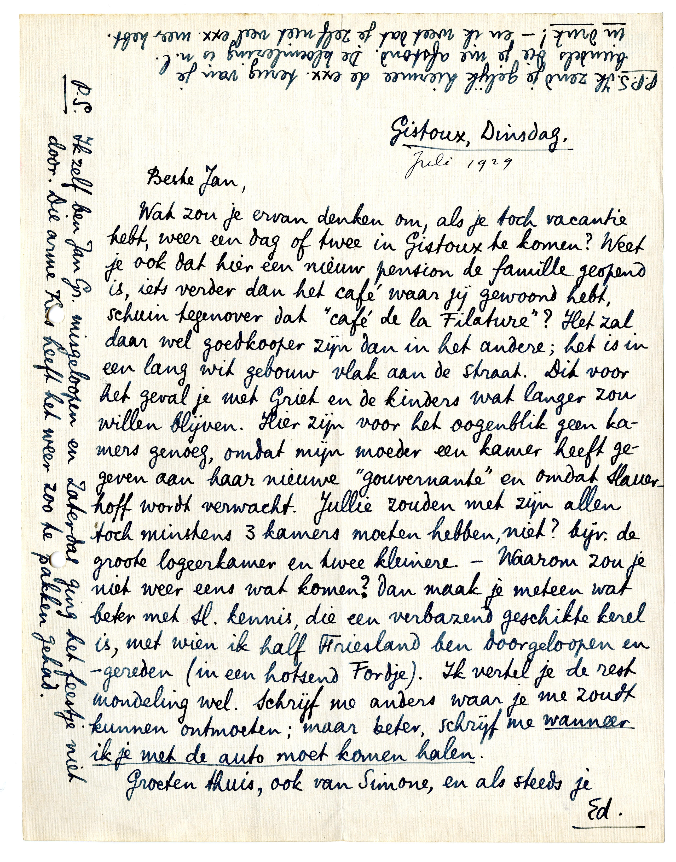 Wat zou je ervan denken om, als je toch vacantie hebt, weer een dag of twee in Gistoux te komen? Weet je ook dat hier een nieuw pension de familie geopend is, iets verder dan het café waar jij gewoond hebt654, schuin tegenover dat ‘café de la Filature’? Het zal daar wel goedkooper zijn dan in het andere; het is in een lang wit gebouw vlak aan de straat. Dit voor het geval je met Griet en de kinders wat langer zou willen blijven. Hier zijn voor het oogenblik geen kamers genoeg, omdat mijn moeder een kamer heeft gegeven aan haar nieuwe ‘gouvernante’ en omdat Slauerhoff wordt verwacht. Jullie zouden met zijn allen toch minstens 3 kamers moeten hebben, niet? bijv. de groote logeerkamer en twee kleinere. - Waarom zou je niet weer eens wat komen? Dan maak je meteen wat beter met Sl. kennis, die een verbazend geschikte kerel is, met wien is half Friesland ben doorgeloopen en -gereden (in een hotsend Fordje). Ik vertel je de rest mondeling wel. Schrijf me anders waar je me zoudt kunnen ontmoeten; maar beter, schrijf me wanneer ik je met de auto moet komen halen.