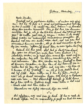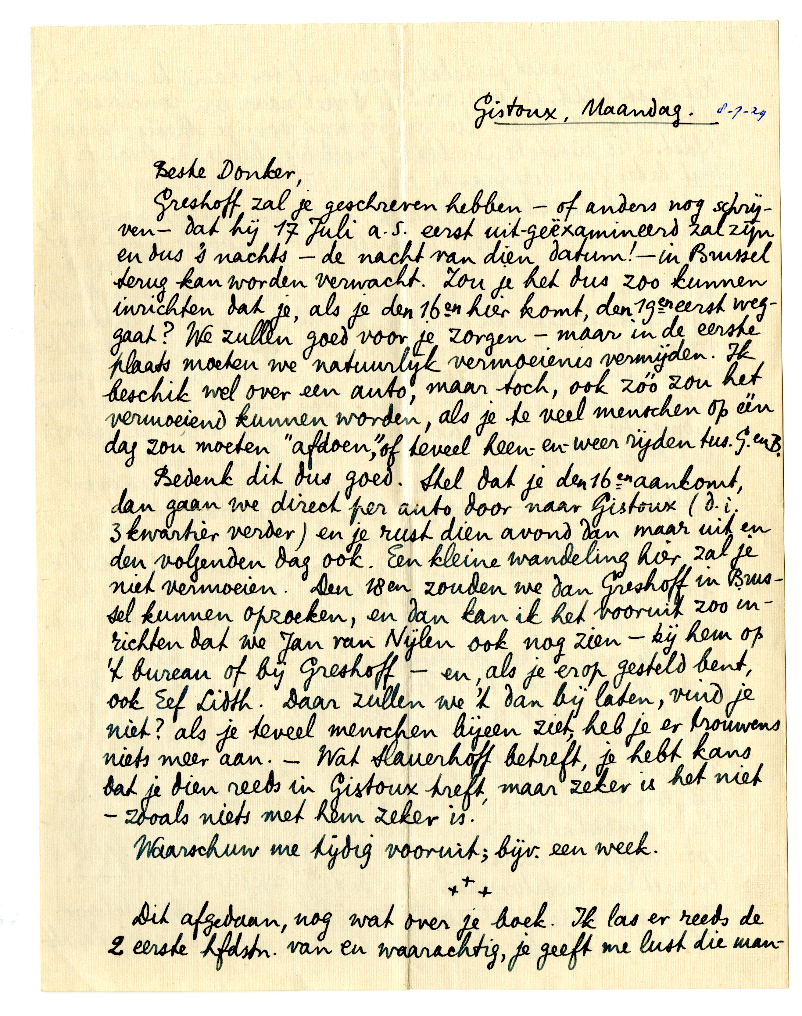 Greshoff zalje geschreven hebben-of anders nog schrijven-dat hij 17 Juli a.s. eerst uit-geëxamineerd zal zijn en dus 's nachts-de nacht van dien datum!-in Brussel terug kan worden verwacht. Zou je het dus zoo kunnen inrichten dat je, als je den 16en hier komt, den 19en eerst weggaat? We zullen goed voor je zorgen-maar in de eerste plaats moeten we natuurlijk vermoeienis vermijden. Ik beschik wel over een auto, maar toch, ook zóó zou het vermoeiend kunnen worden, als je te veel menschen op één dag zou moeten ‘afdoen’, of teveel heen-en-weer rijden tusschen G. en B.