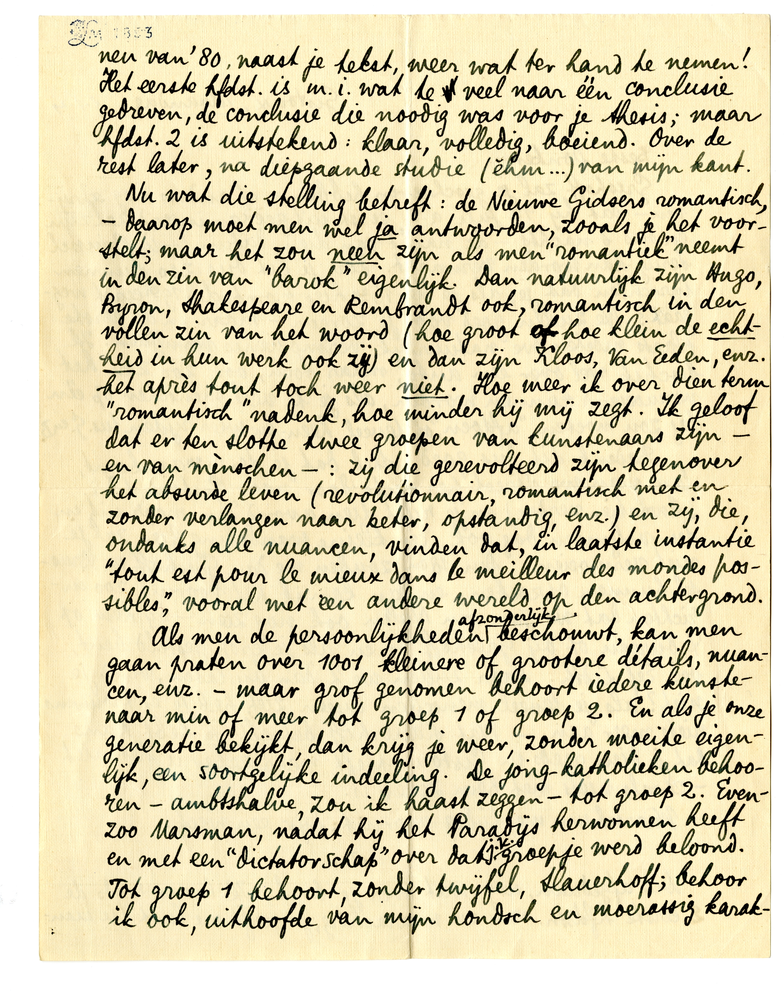 Nu wat die stelling betreft: de Nieuwe Gidsers romantisch,-daarop moet men wel ja antwoorden, zooals je het voorstelt; maar het zou neen zijn als men ‘romantiek’ neemt in den zin van ‘barok’ eigenlijk. Dan natuurlijk zijn Hugo, Byron, Shakespeare en Rembrandt ook, romantisch in den vollen zin van het woord (hoe groot of hoe klein de echtheid in hun werk ook zij) en dan zijn Kloos, Van Eeden, enz. het après tout toch weer niet. Hoe meer ik over dien term ‘romantisch’ nadenk, hoe minder hij mij zegt. Ik geloof dat er ten slotte twee groepen van kunstenaars zijn-en van mènschen-: zij die gerevolteerd zijn tegenover het absurde leven (revolutionnair, romantisch met en zonder verlangen naar beter, opstandig, enz.) en zij, die, ondanks alle nuancen, vinden dat, in laatste instantie ‘tout est pour le mieux dans le meilleur des mondes possibles’668, vooral met een andere wereld op den achtergrond.