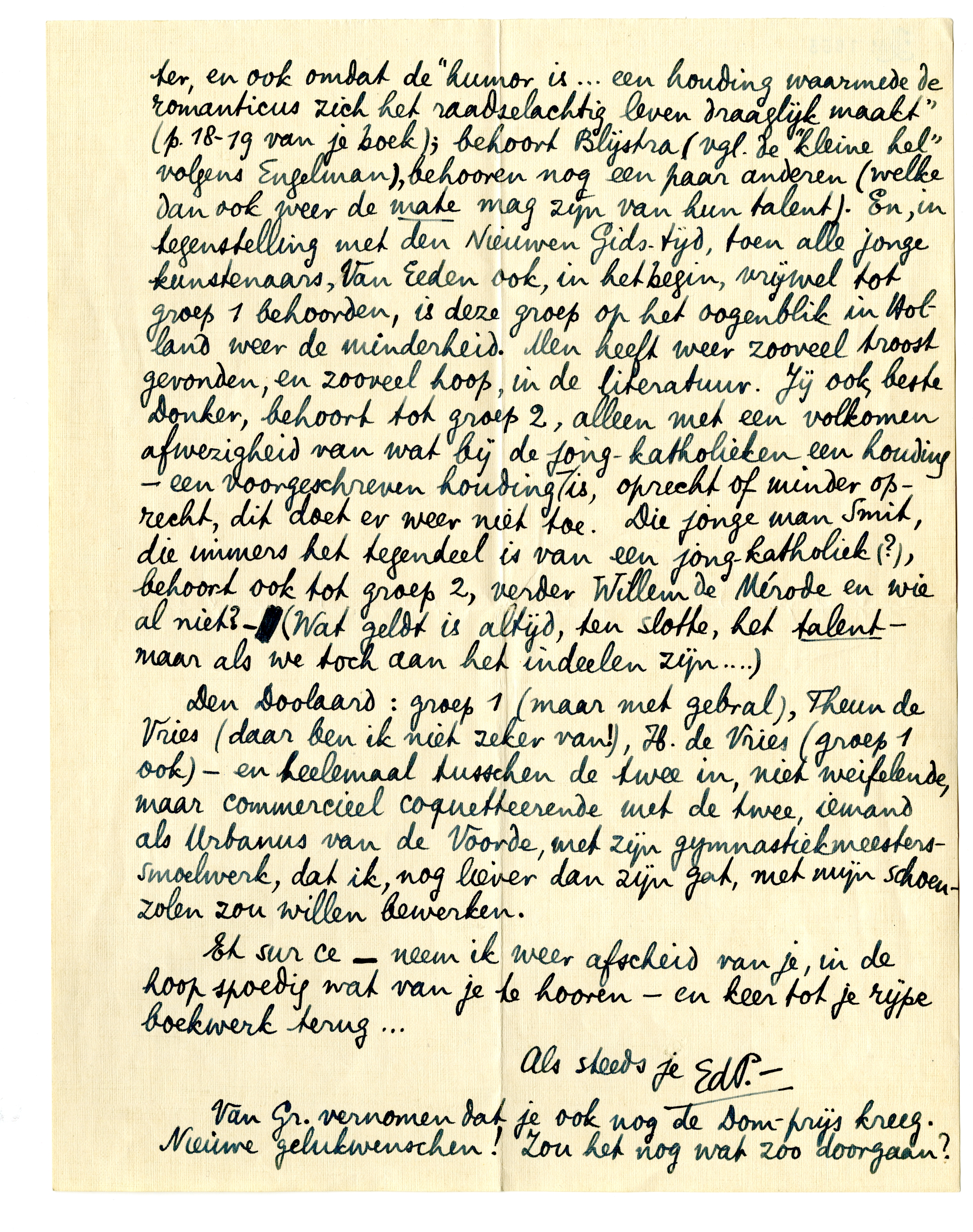 Als men de persoonlijkheden afzonderlijk beschouwt, kan men gaan praten over 1001 kleinere of grootere détails, nuancen, enz. - maar grof genomen behoort iedere kunstenaar min of meer tot groep 1 of groep 2. En als je onze generatie bekijkt, dan krijg je weer, zonder moeite eigenlijk, een soortgelijke indeeling. De jong-katholieken behooren-ambtshalve, zou ik haast zeggen-tot groep 2. Evenzoo Marsman, nadat hij het Paradijs herwonnen heeft en met een ‘dictatorschap’ over dat j.k. groepje werd beloond. Tot groep 1 behoort, zonder twijfel, Slauerhoff; behoor ik ook, uithoofde van mijn hondsch en moerassig karakter669, en ook omdat de ‘humor is... een houding waarmede de romanticus zich het raadselachtig leven draaglijk maakt’ (p. 18-19 van je boek); behoort Blijstra (vgl. de ‘kleine hel’ volgens Engelman), behooren nog een paar anderen (welke dan ook weer de mate mag zijn van hun talent). En, in tegenstelling met den Nieuwen Gids-tijd, toen alle jonge kunstenaars, Van Eeden ook, in het begin, vrijwel tot groep 1 behoorden, is deze groep op het oogenblik in Holland weer de minderheid. Men heeft weer zooveel troost gevonden, en zooveel hoop, in de literatuur. Jij ook, beste Donker, behoort tot groep 2, alleen met een volkomen afwezigheid van wat bij de jong-katholieken een houding-een voorgeschreven houding-is, oprecht of minder oprecht, dit doet er weer niet toe. Die jonge man Smit, die immers het tegendeel is van een jong-katholiek (?),670 behoort ook tot groep 2, verder Willem de Mérode en wie al niet?-(wat geldt is altijd, ten slotte, het talent-maar als we toch aan het indeelen zijn....)