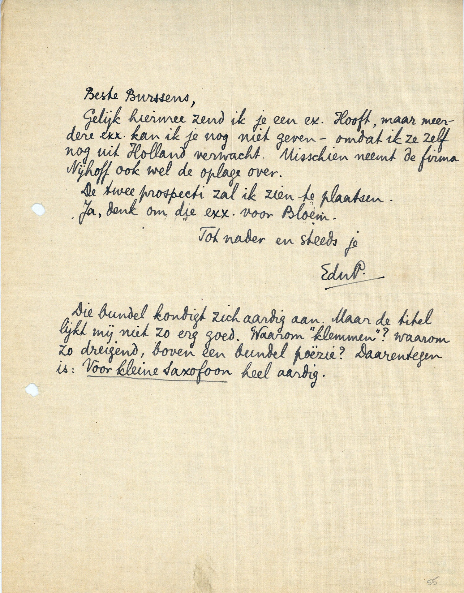 Die bundel kondigt zich aardig aan. Maar de titel lijkt mij niet zo erg goed. Waarom ‘klemmen’? waarom zo dreigend, boven een bundel poëzie? Daarentegen is: Voor kleine Saxofoon676 heel aardig.