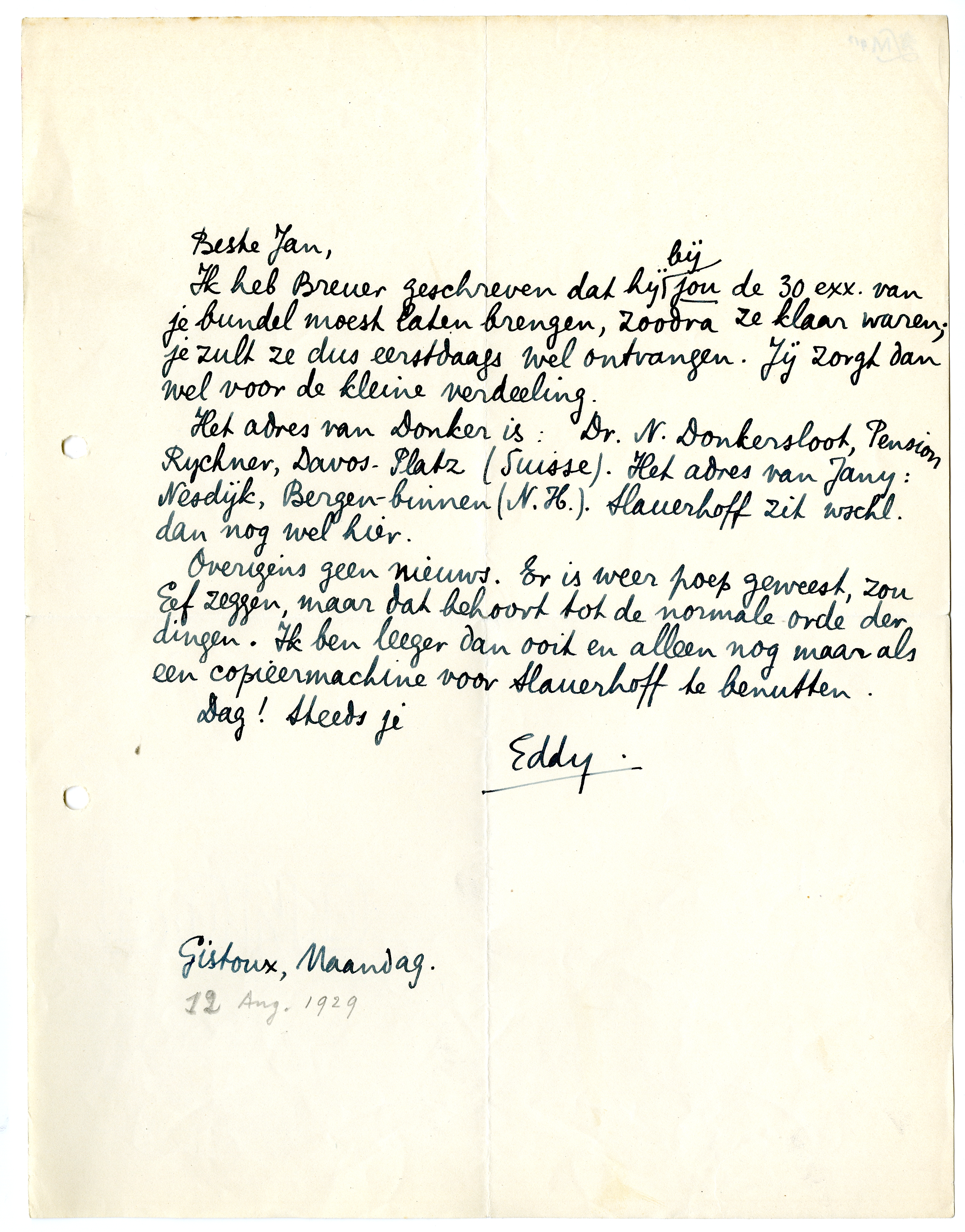 Het adres van Donker is: Dr. N. Donkersloot, Pension Rychner, Davos-Platz (Suisse). Het adres van Jany: Nesdijk, Bergen-binnen (N.H.). Slauerhoff zit wschl. dan nog wel hier.