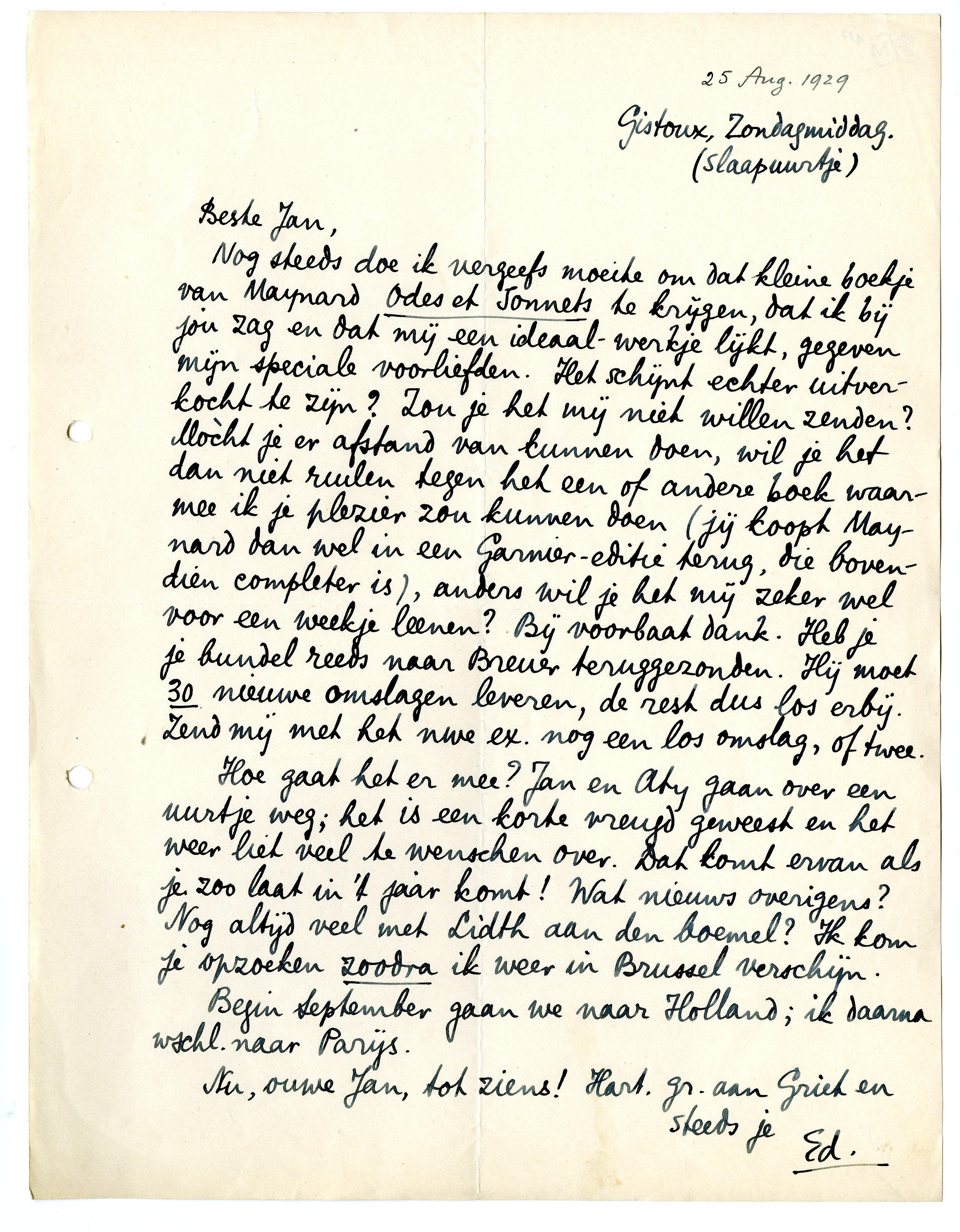 Nog steeds doe ik vergeefs moeite om dat kleine boekje van Maynard Odes et Sonnets te krijgen, dat ik bij jou zag en dat mij een ideaalwerkje lijkt, gegeven mijn speciale voorliefden. Het schijnt echter uitverkocht te zijn? Zou je het mij niet willen zenden? Mòcht je er afstand van kunnen doen, wil je het dan niet ruilen tegen het een of andere boek waarmee ik je plezier zou kunnen doen (jij koopt Maynard dan wel in een Garnier-editie terug, die bovendien completer is), anders wil je het mij zeker wel voor een weekje leenen? Bij voorbaat dank. Heb je je bundel reeds naar Breuer teruggezonden. Hij moet 30 nieuwe omslagen leveren, de rest dus los erbij. Zend mij met het nwe ex. nog een los omslag, of twee.