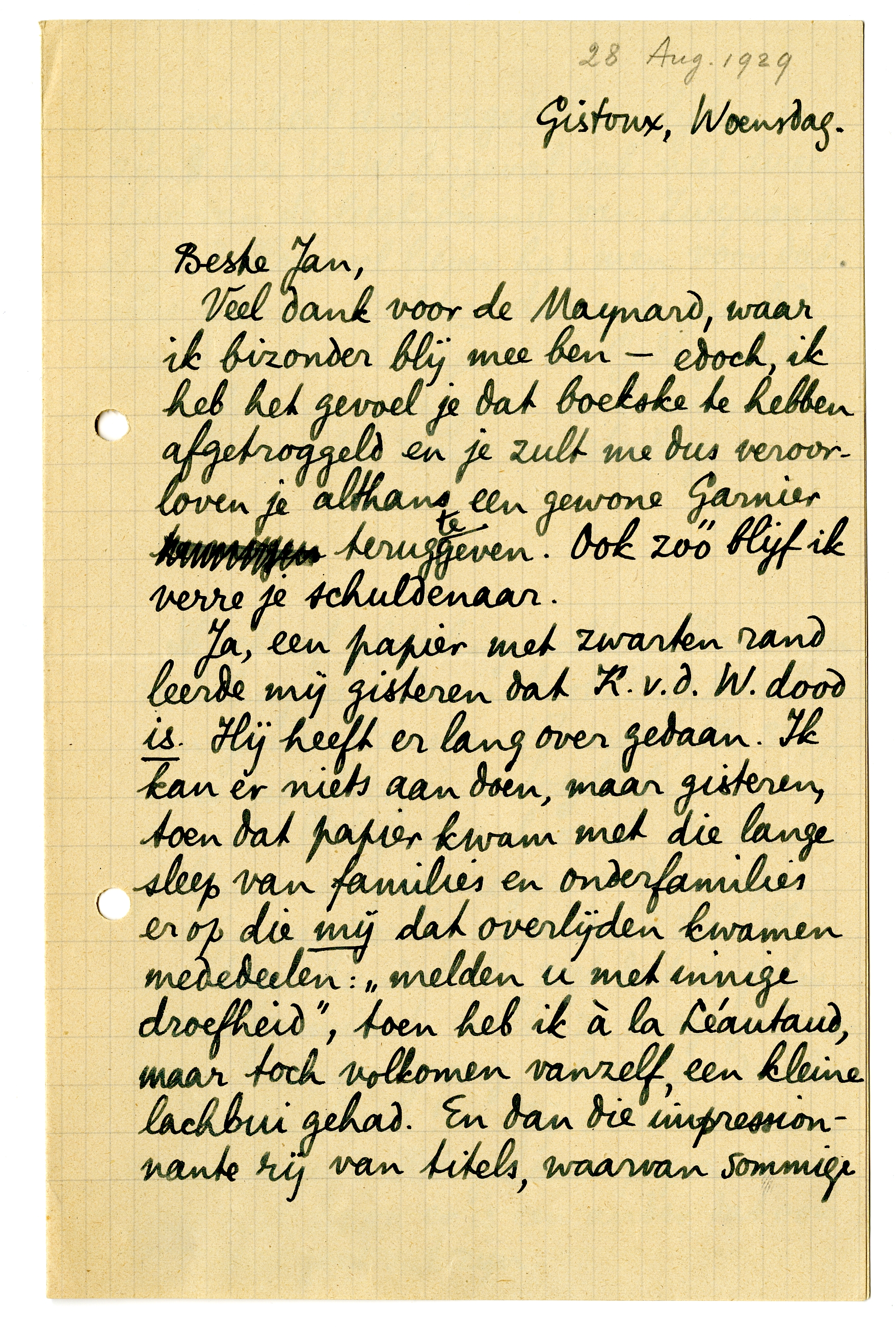 Ja, een papier met zwarten rand leerde mij gisteren dat K.v.d.W. dood is.689 Hij heeft er lang over gedaan. Ik kan er niets aan doen, maar gisteren, toen dat papier kwam met die lange sleep van families en onderfamilies er op die mij dat overlijden kwamen mededeelen: ‘melden u met innige droefheid’, toen heb ik à la Léautaud, maar toch volkomen vanzelf, een kleine lachbui gehad. En dan die impressionante rij van titels, waarvan sommige mij van héél diep opgedolven lijken te zijn. Was V.d.W. bijgeval ook niet directeur van de leestrommel van Zwijnaarde of zoo? Hoe veel liever had men voor dat alles gelezen: Dichter, desnoods gevolgd door, tusschen haakjes: ‘bij Gods genade’.