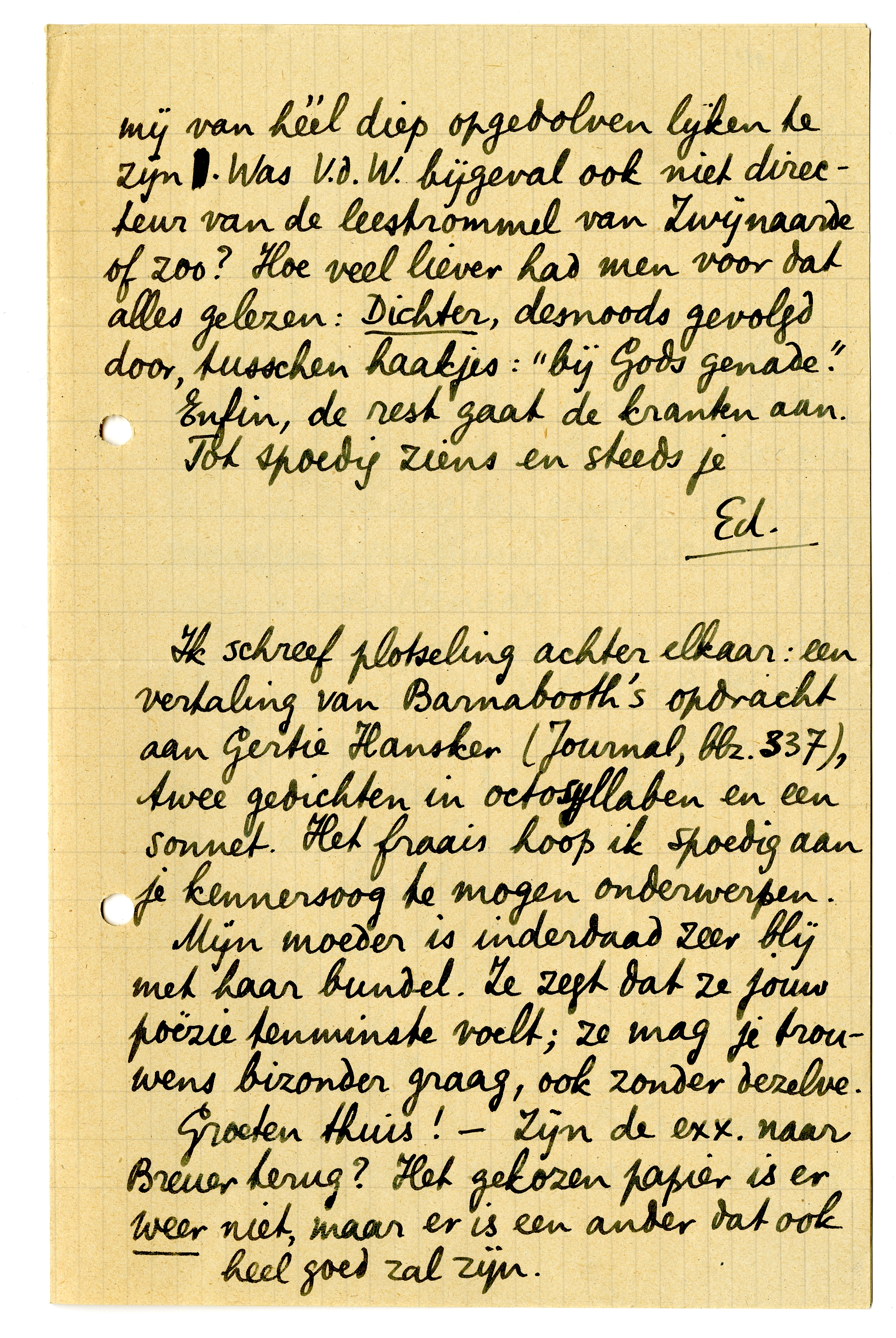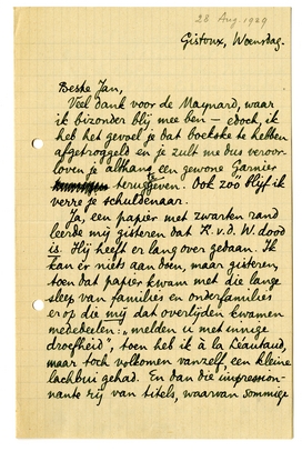 Ik schreef plotseling achter elkaar: een vertaling van Barnabooth's opdracht aan Gerthie Hansker690 Qournal, blz. 337), twee gedichten in octosyllaben en een sonnet.691 Het fraais hoop ik spoedig aan je ken-nersoog te mogen onderwerpen.