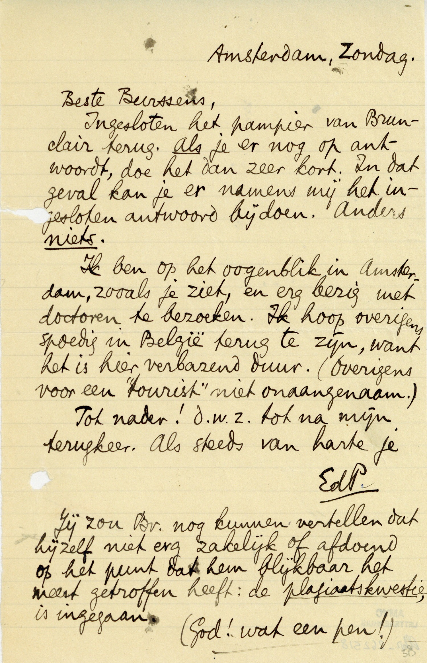 Ik ben op het oogenblik in Amsterdam, zooals je ziet, en erg bezig met doctoren te bezoeken. Ik hoop overigens spoedig in België terug te zijn, want het is hier verbazend duur. (Overigens voor een ‘tourist’ niet onaangenaam.)