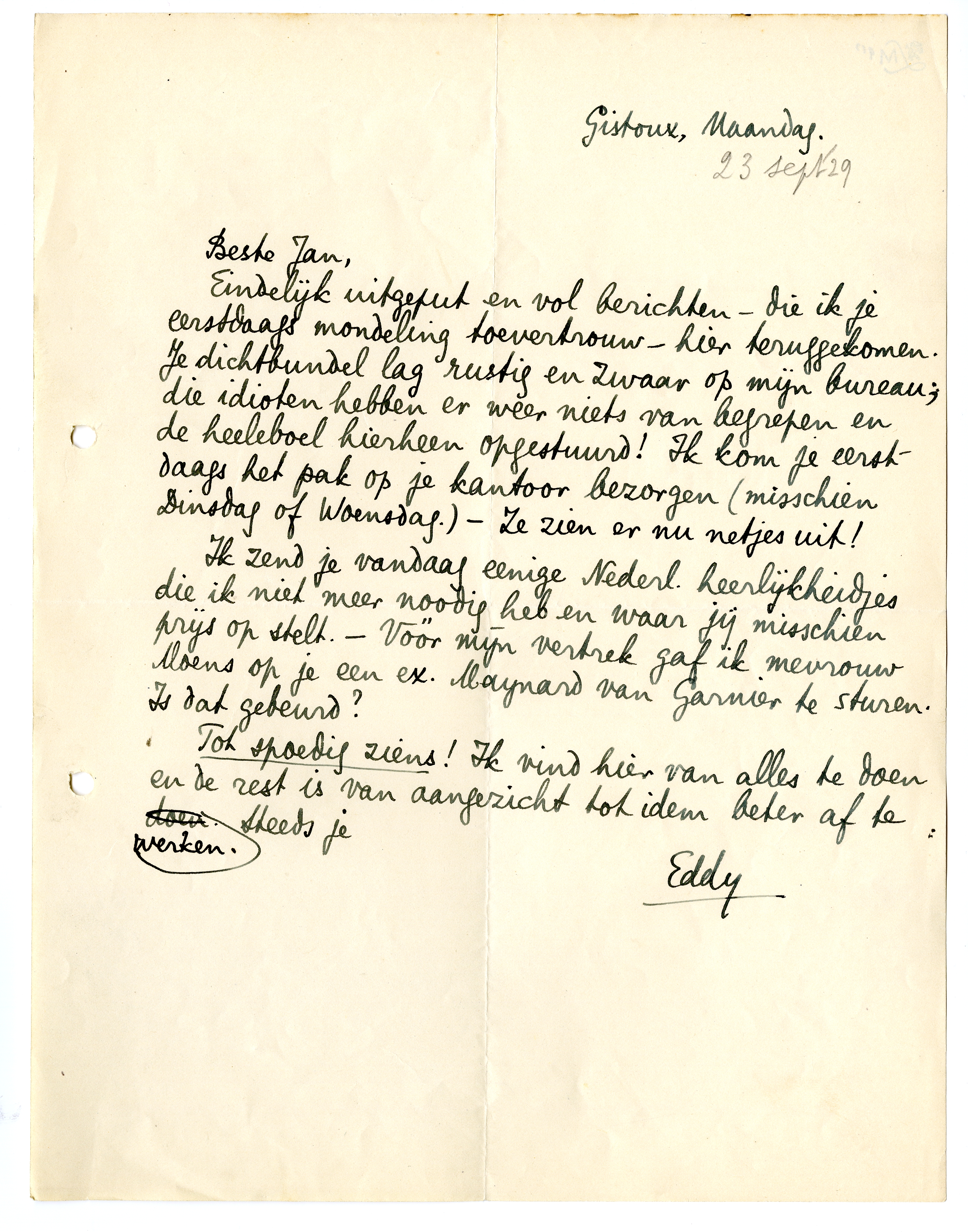 Eindelijk uitgeput en vol berichten-die ik je eerstdaags mondeling toevertrouw-hier teruggekomen. Je dichtbundel lag rustig en zwaar op mijn bureau; die idioten hebben er weer niets van begrepen en de heeleboel hierheen opgestuurd! Ik kom je eerstdaags het pak op je kantoor bezorgen (misschien Dinsdag of Woensdag.)-Ze zien er nu netjes uit!