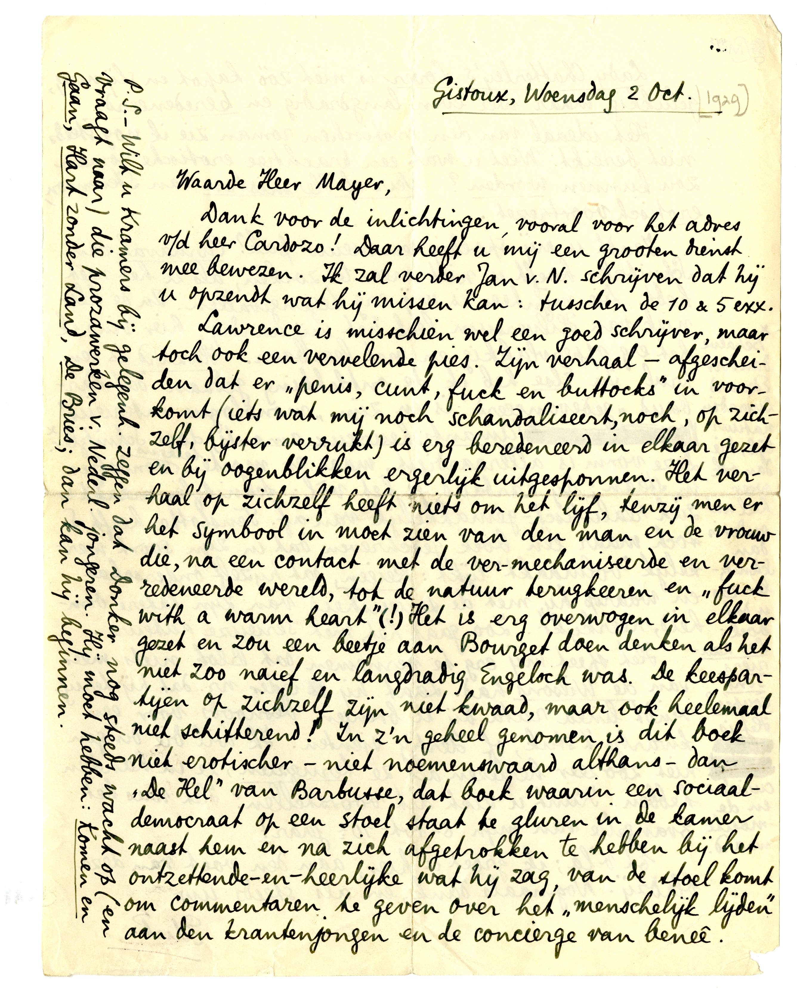 Lawrence is misschien wel een goed schrijver, maar toch ook een vervelende pies. Zijn verhaal701-afgescheiden dat er ‘penis, cunt, fuck en buttocks’ in voorkomt (iets wat mij noch schandaliseert, noch, op zichzelf, bijster verrukt) is erg beredeneerd in elkaar gezet en bij oogenblikken ergerlijk uitgesponnen. Het verhaal op zichzelf heeft niets om het lijf, tenzij men er het symbool in moet zien van den man en de vrouw die, na een contact met de ver-mechaniseerde en verredeneerde wereld, tot de natuur terugkeeren en ‘fuck with a warm heart’ (!) Het is erg overwogen in elkaar gezet en zou een beetje aan Bourget doen denken als het niet zoo naief en langdradig Engelsch was. De keespartijen op zichzelf zijn niet kwaad, maar ook heelemaal niet schitterend! In z'n geheel genomen is dit boek niet erotischer-niet noemenswaard althans-dan ‘De Hel’ van Barbusse,702 dat boek waarin een sociaal-democraat op een stoel staat te gluren in de kamer naast hem en na zich afgetrokken te hebben bij het ontzettende-enheerlijke wat hij zag, van de stoel komt om commentaren te geven over het ‘menschelijk lijden’ aan den krantenjongen en de concierge van beneê.