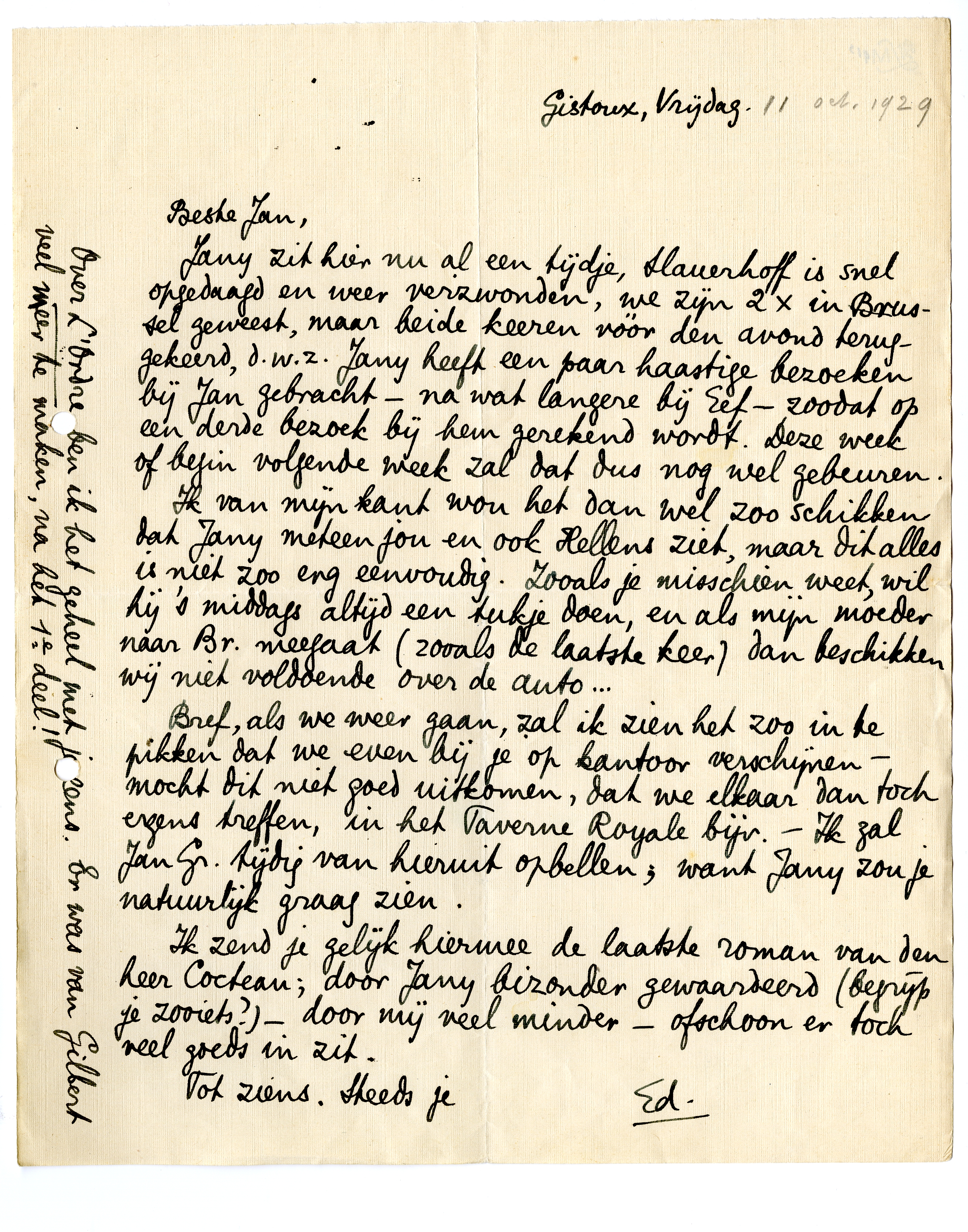 Ik zend je gelijk hiermee de laatste roman van den heer Cocteau713; door Jany bizonder gewaardeerd (begrijp je zooiets?) - door mij veel minder - ofschoon er toch veel goeds in zit.