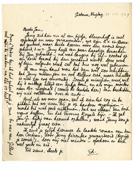 Jany zit hier nu al een tijdje, Slauerhoff is snel opgedaagd en weer verzwonden, we zijn 2 × in Brussel geweest, maar beide keeren vóór den avond teruggekeerd, d.w.z. Jany heeft een paar haastige bezoeken bij Jan gebracht - na wat langere bij Eef - zoodat op een derde bezoek bij hem gerekend wordt. Deze week of begin volgende week zal dat dus nog wel gebeuren.