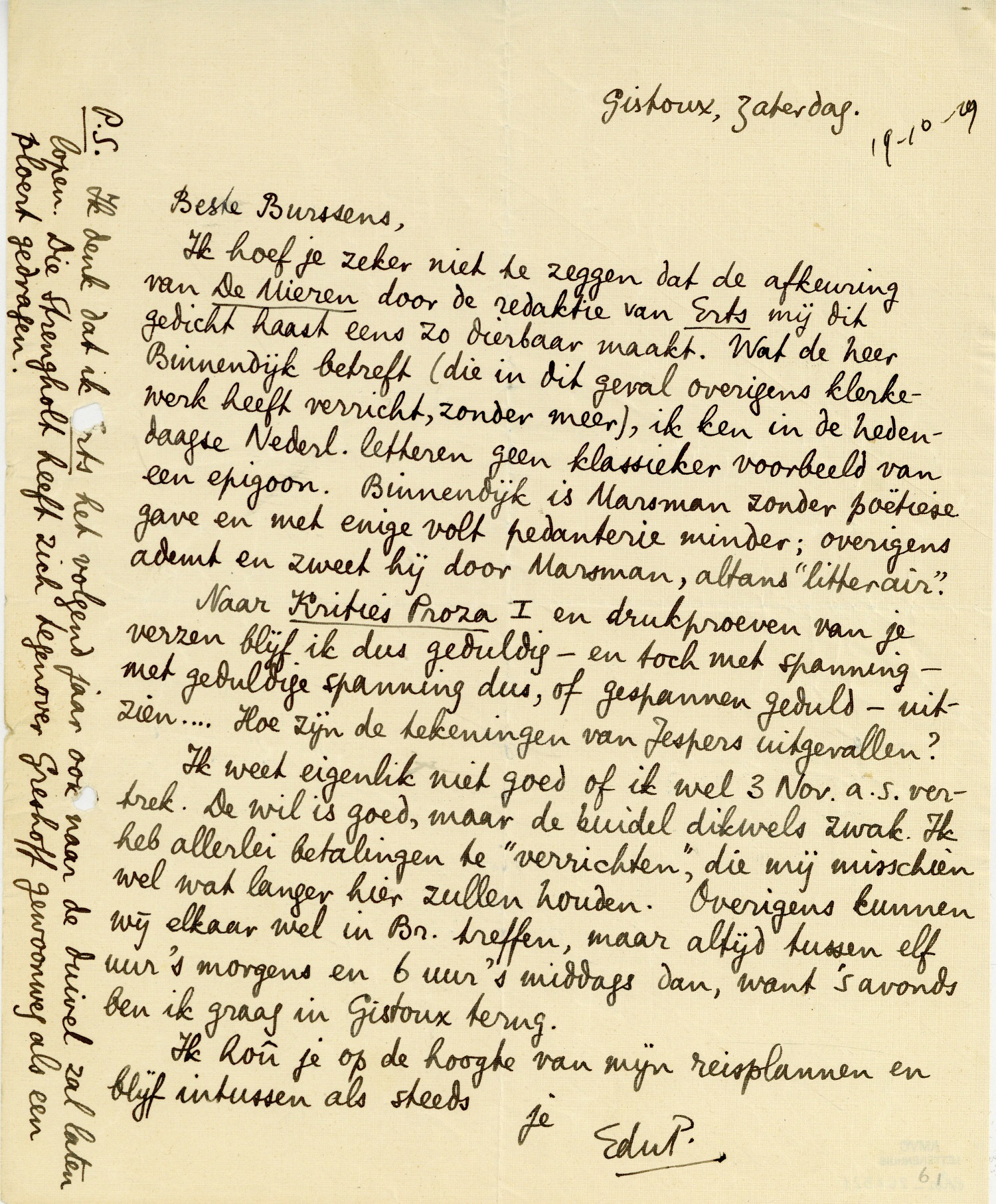 Ik weet eigenlik niet goed of ik wel 3 Nov. a.s. vertrek. De wil is goed, maar de buidel dikwels zwak. Ik heb allerlei betalingen te ‘ver-richten’, die mij misschien wel wat langer hier zullen houden. Overigens kunnen wij elkaar wel in Br. treffen, maar altijd tussen elf uur 's morgens en 6 uur 's middags dan, want 's avonds ben ik graag in Gistoux terug.