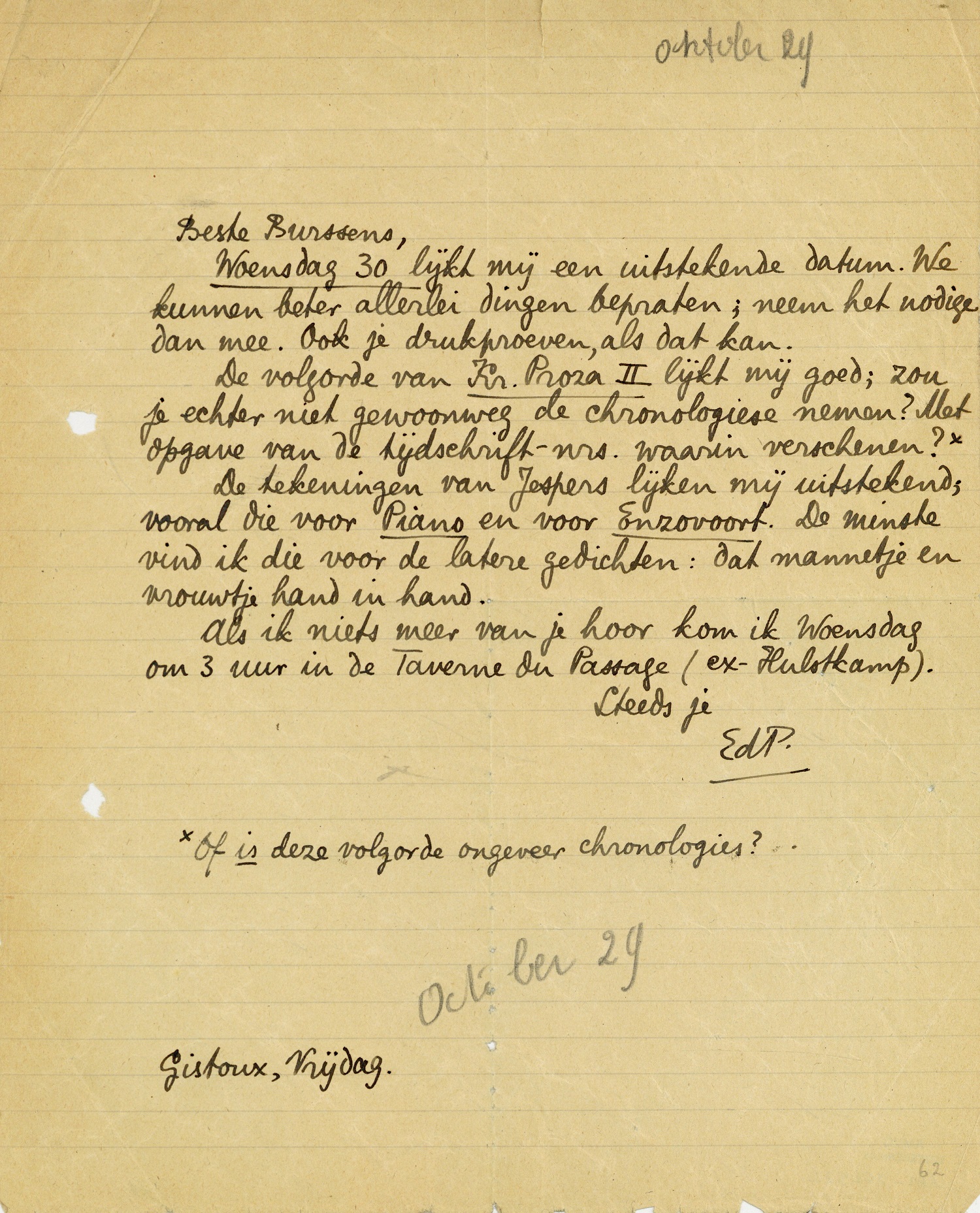 Als ik niets meer van je hoor kom ik Woensdag om 3 uur in de Taverne du Passage (ex-Hulstkamp).